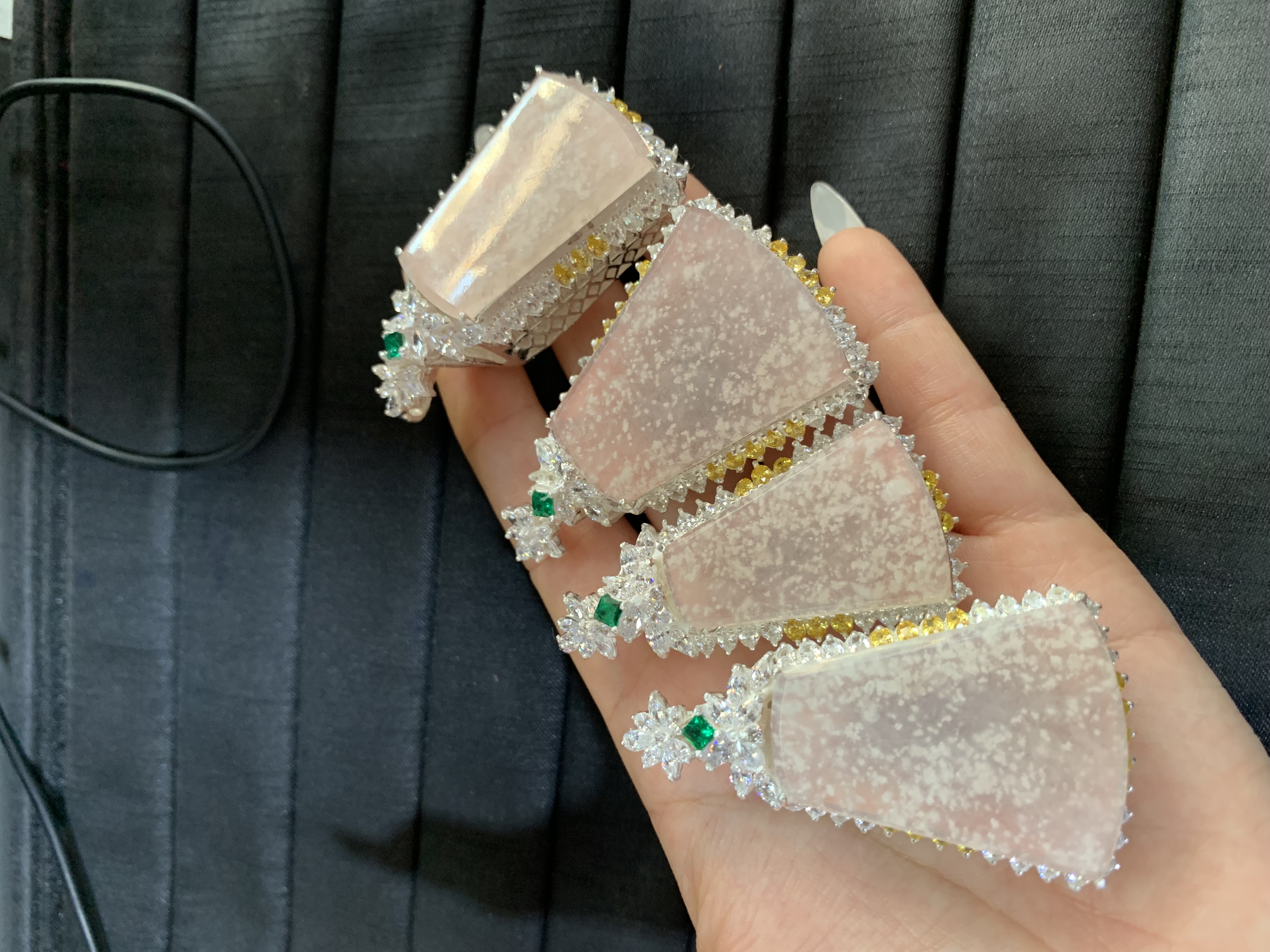 This set features five distinctive pendants with large pink gems showcasing a unique frosted, speckled texture in varying shapes (trapezoidal and rectangular). Each piece is set in silver-toned metal adorned with sparkling clear accents, plus small green and yellow gem details for a vibrant touch. The luxurious design makes them ideal for crafting statement necklaces, perfect for elevating both formal and special occasion attire.