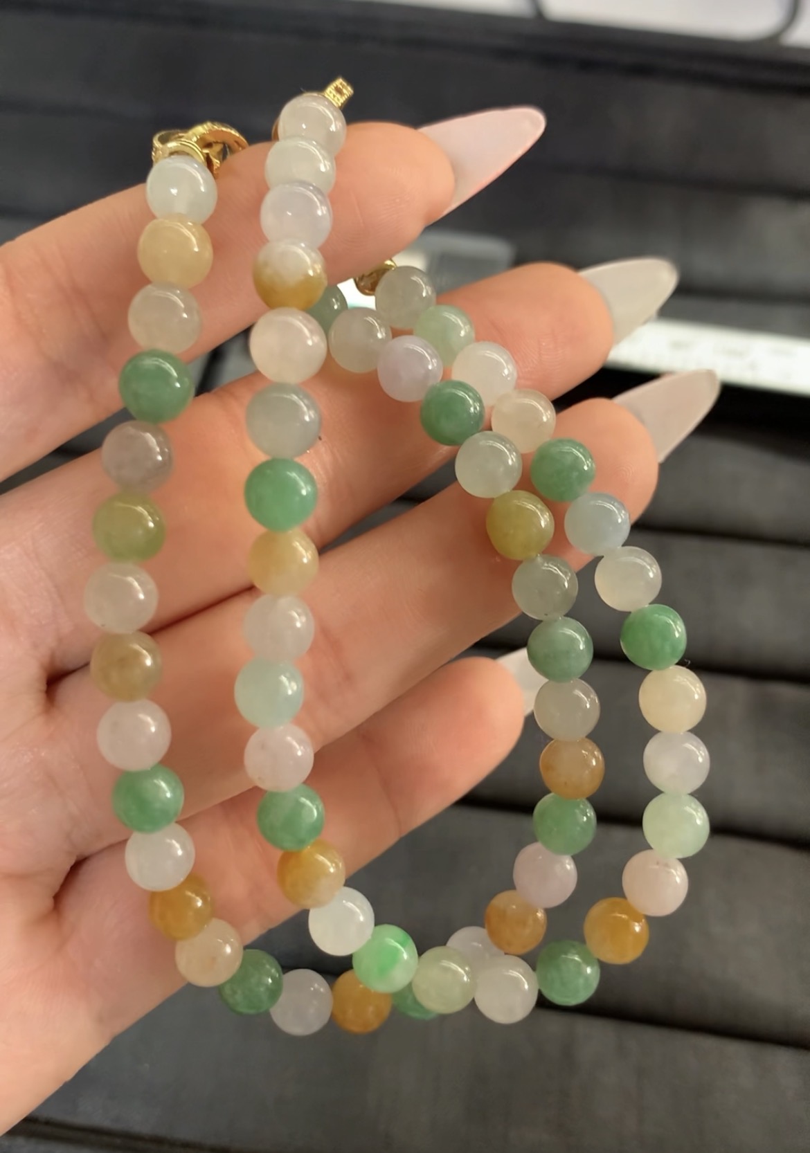 This eye-catching necklace features round, polished jadeite beads in a delightful mix of colors – including green, yellow, white, and subtle lavender tones. The beads are strung into a long strand with a gleaming gold-tone clasp, offering versatility to be worn single or layered. The natural color variation and smooth texture give the piece a vibrant yet elegant charm, perfect for adding a pop of color to any outfit.