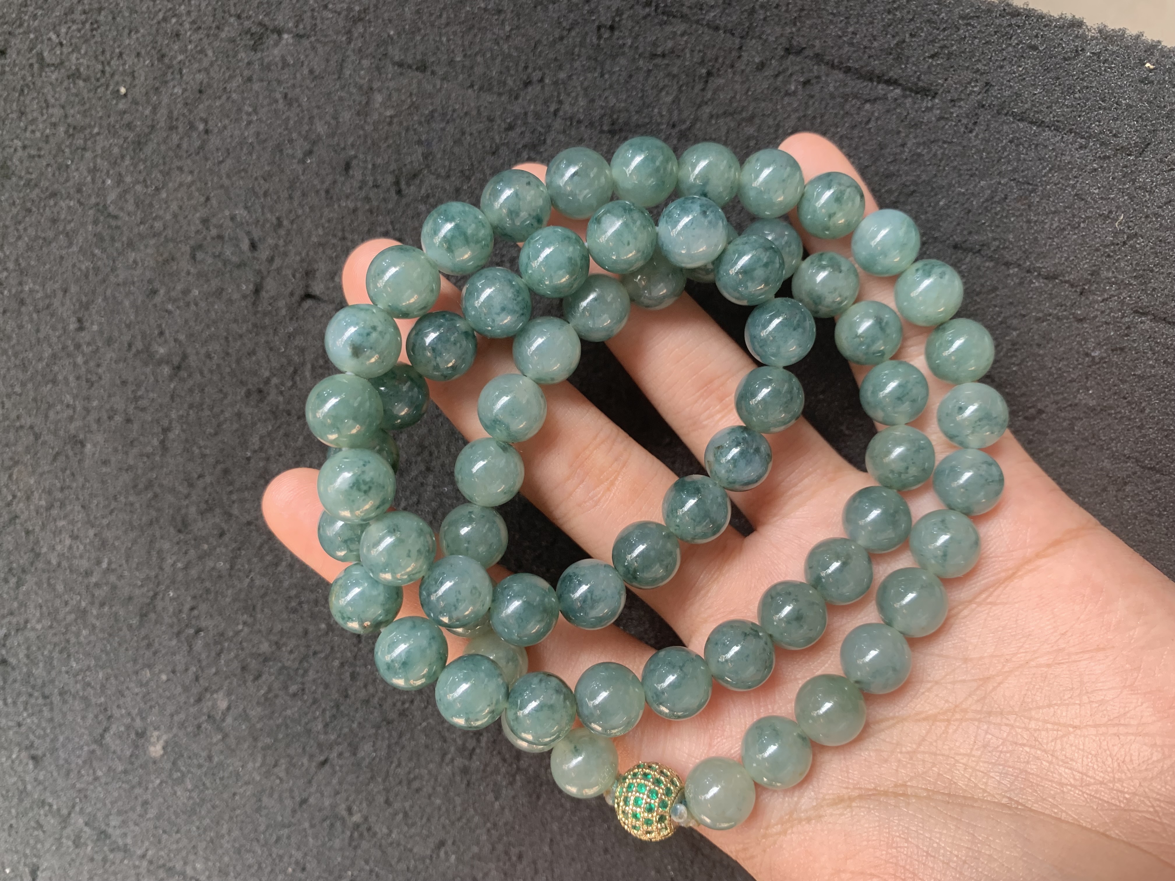 A single or multi-wrap bracelet made of round dark green jadeite beads with characteristic "moss-in-snow" patterns, giving each bead a unique and natural appearance. It features a decorative gold-toned clasp inlaid with small green stones, adding a touch of elegance to the classic gemstone piece.