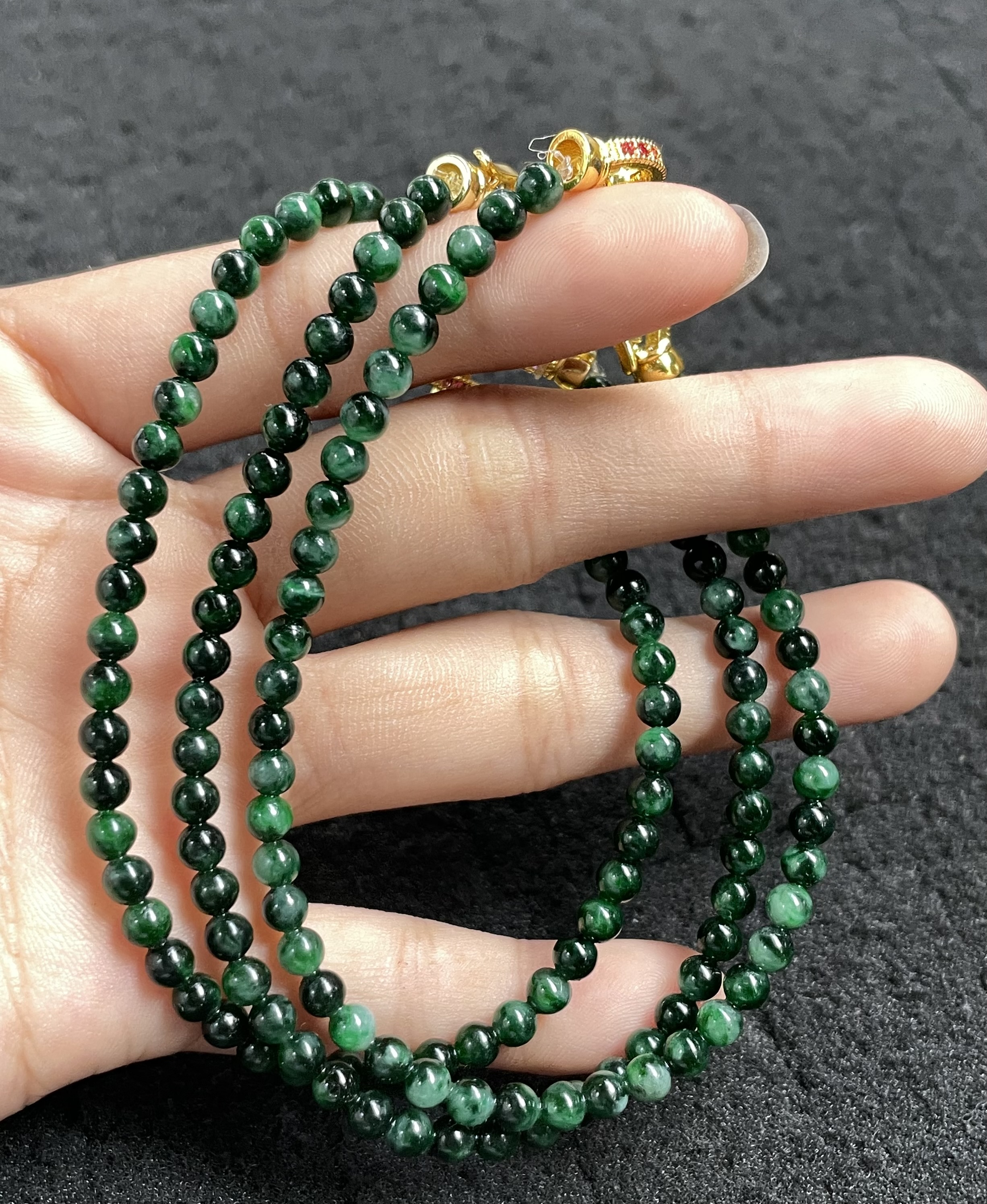 This stunning piece features multiple strands of round deep green jadeite beads with natural texture variations, exuding a rich and luxurious look. The necklace is finished with ornate gold-toned hardware and decorative accents, blending classic gemstone elegance with exquisite detailing, ideal for adding a sophisticated touch to any ensemble.
