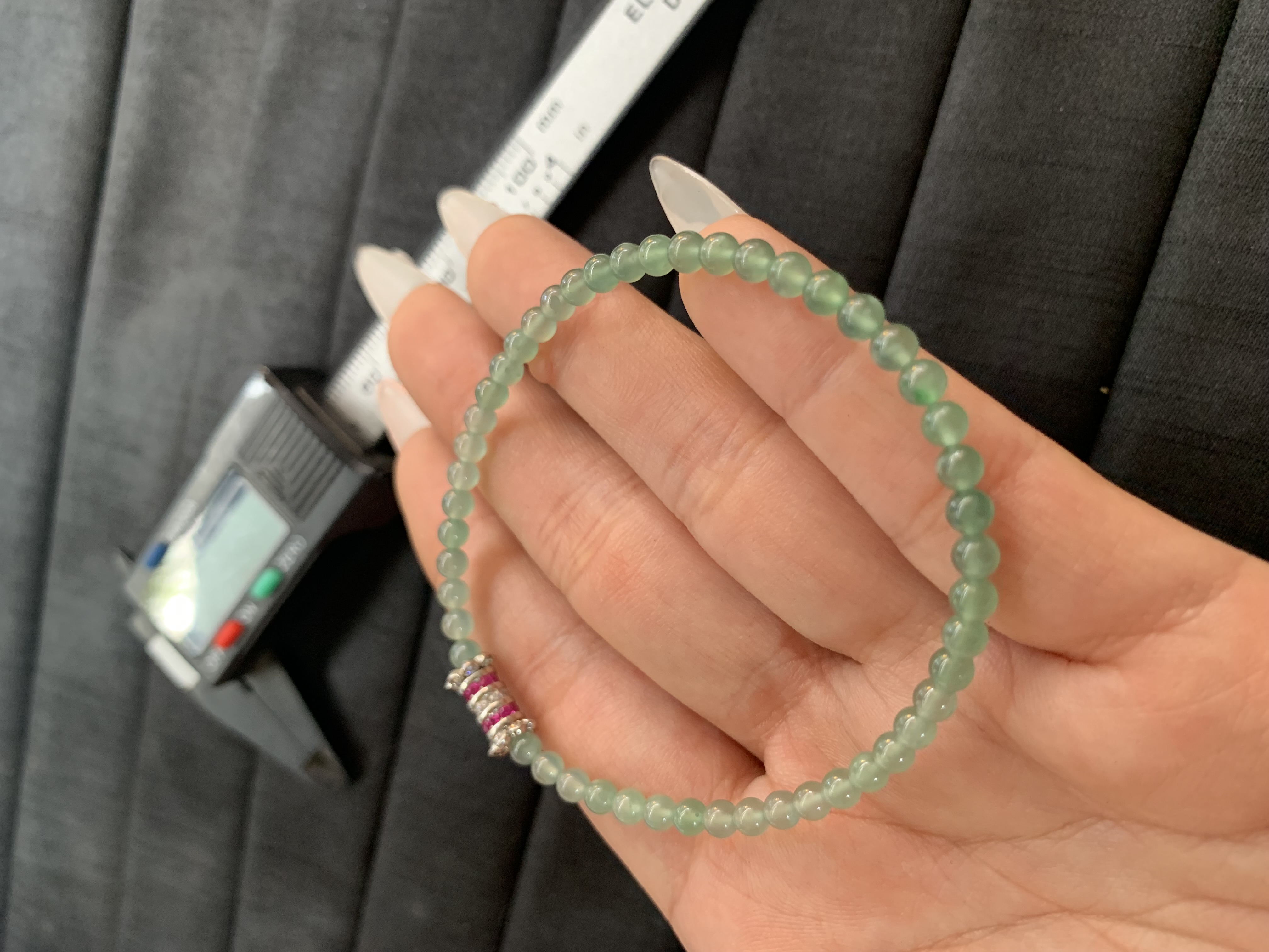 This dainty bracelet is crafted from small, smooth, round light green jade beads with a subtle translucent quality and natural luster. It features a decorative metal clasp adorned with tiny red and clear accents, adding a touch of sparkle and elegance. The minimalist design makes it a refined accessory ideal for everyday wear or layering with other pieces to enhance any look