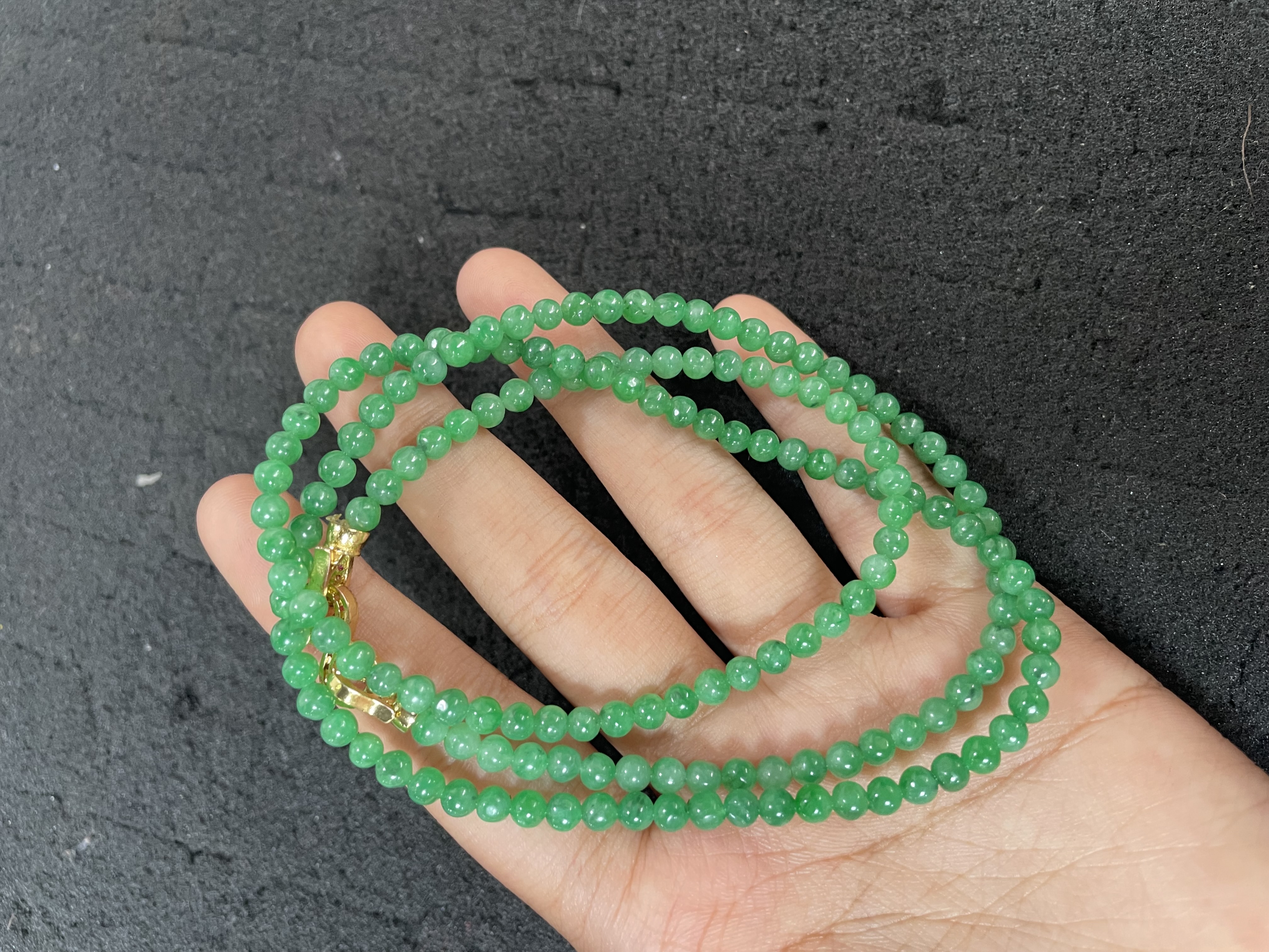 This stunning necklace features multiple strands of small, smooth round vivid green beads with a polished finish, creating a rich layered look. The beads are neatly strung together and secured with a gleaming gold-toned clasp, adding a touch of luxury. It’s perfect for elevating both casual and formal outfits with its vibrant color and elegant design.