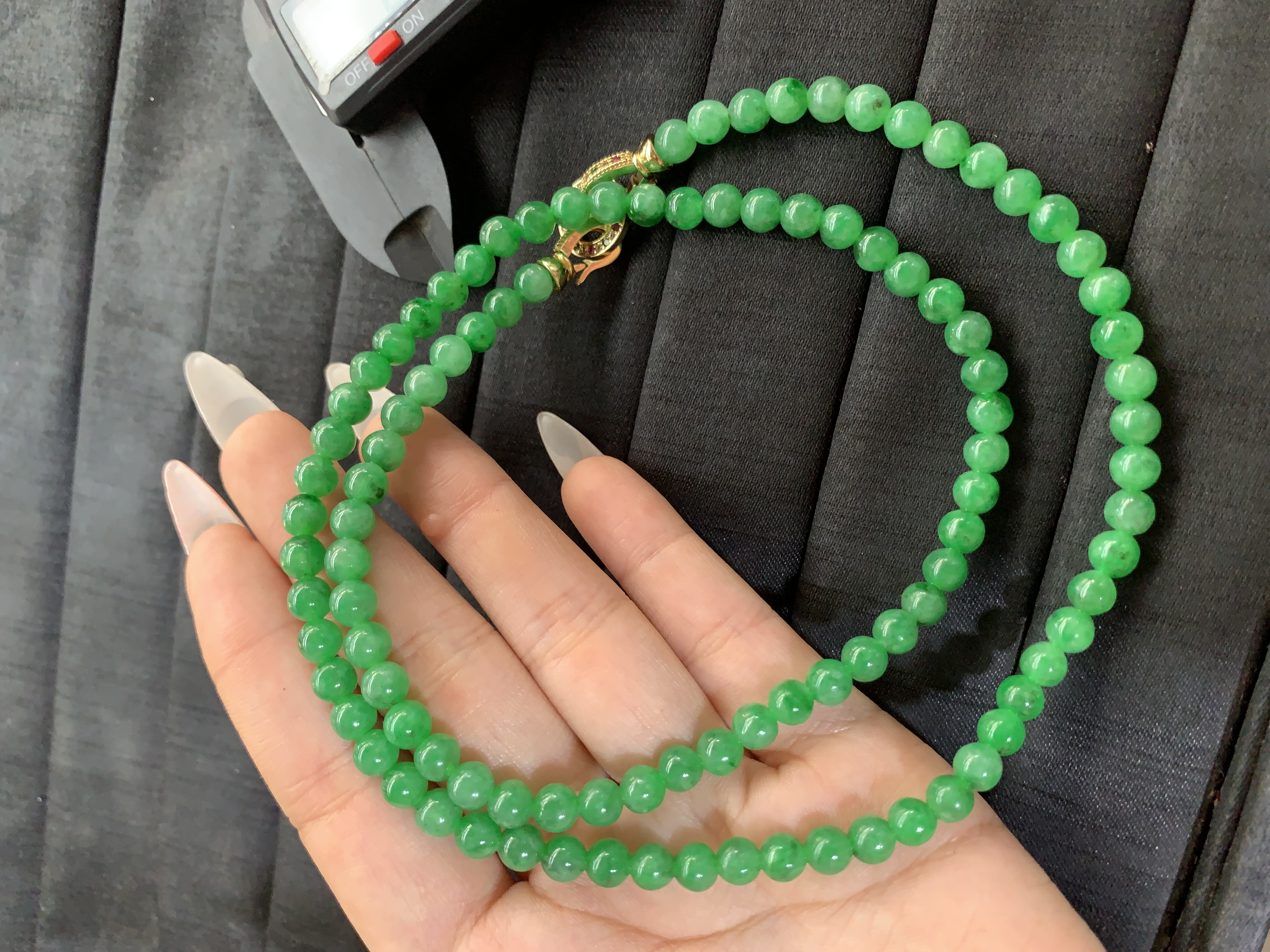 : A classic necklace composed of uniformly sized round green beads, displaying a rich and consistent hue. It is finished with an ornate gold-toned clasp, combining timeless style with subtle luxury. A caliper is partially visible in the background, suggesting precise measurement or evaluation of the piece.