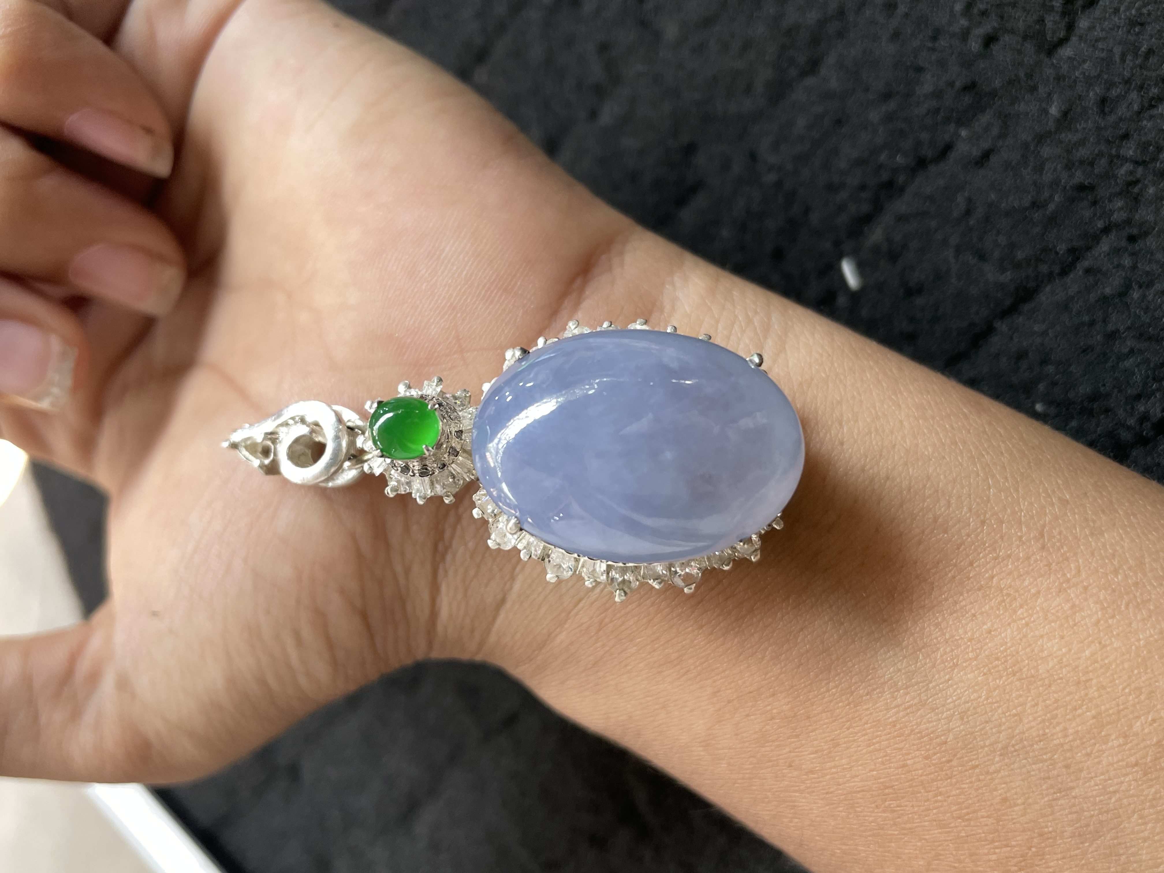 A hand displays a prominent pendant featuring a large oval-shaped lavender gemstone with a smooth, polished surface. The gem is framed by a silver-toned metal border adorned with small clear stones, and topped with a vivid green gemstone accent. The pendant is placed on a wrist against a dark, matte background, highlighting its delicate color and intricate design.