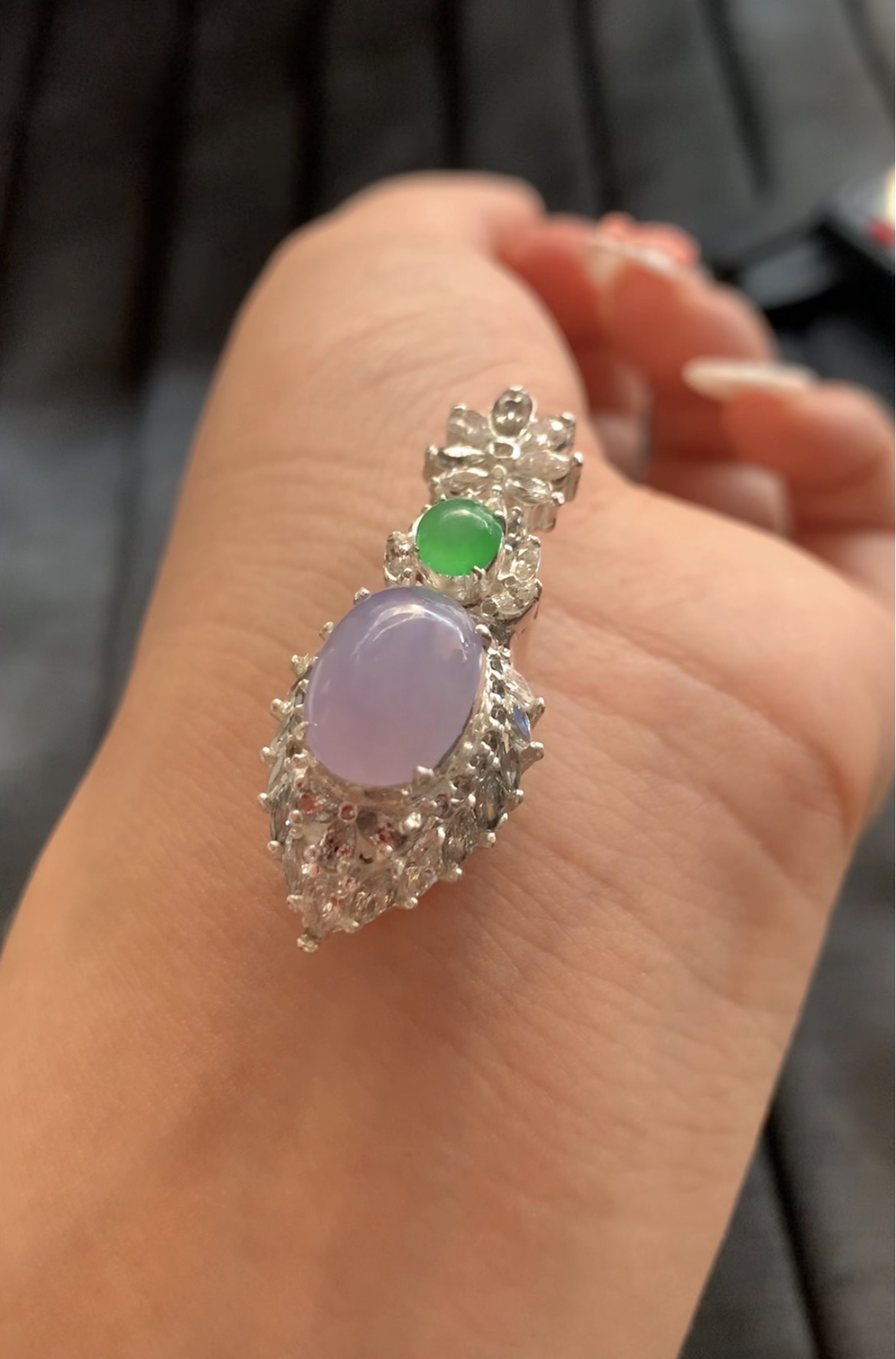This exquisite pendant features a large, oval-shaped lavender jade cabochon as its centerpiece, showcasing a soft, dreamy hue with excellent translucency and a smooth, glossy finish. Above it sits a smaller, vibrant green jade stone, creating a striking color contrast. Both stones are set within an intricate silver-toned mounting adorned with numerous sparkling clear stones, arranged in a detailed floral and leaf-like pattern that adds depth and brilliance. The top of the pendant is designed with a delicate flower-shaped element, enhancing its overall elegance and charm. A perfect blend of natural beauty and fine craftsmanship, this pendant is a truly unique and sophisticated piece of jewelry.
