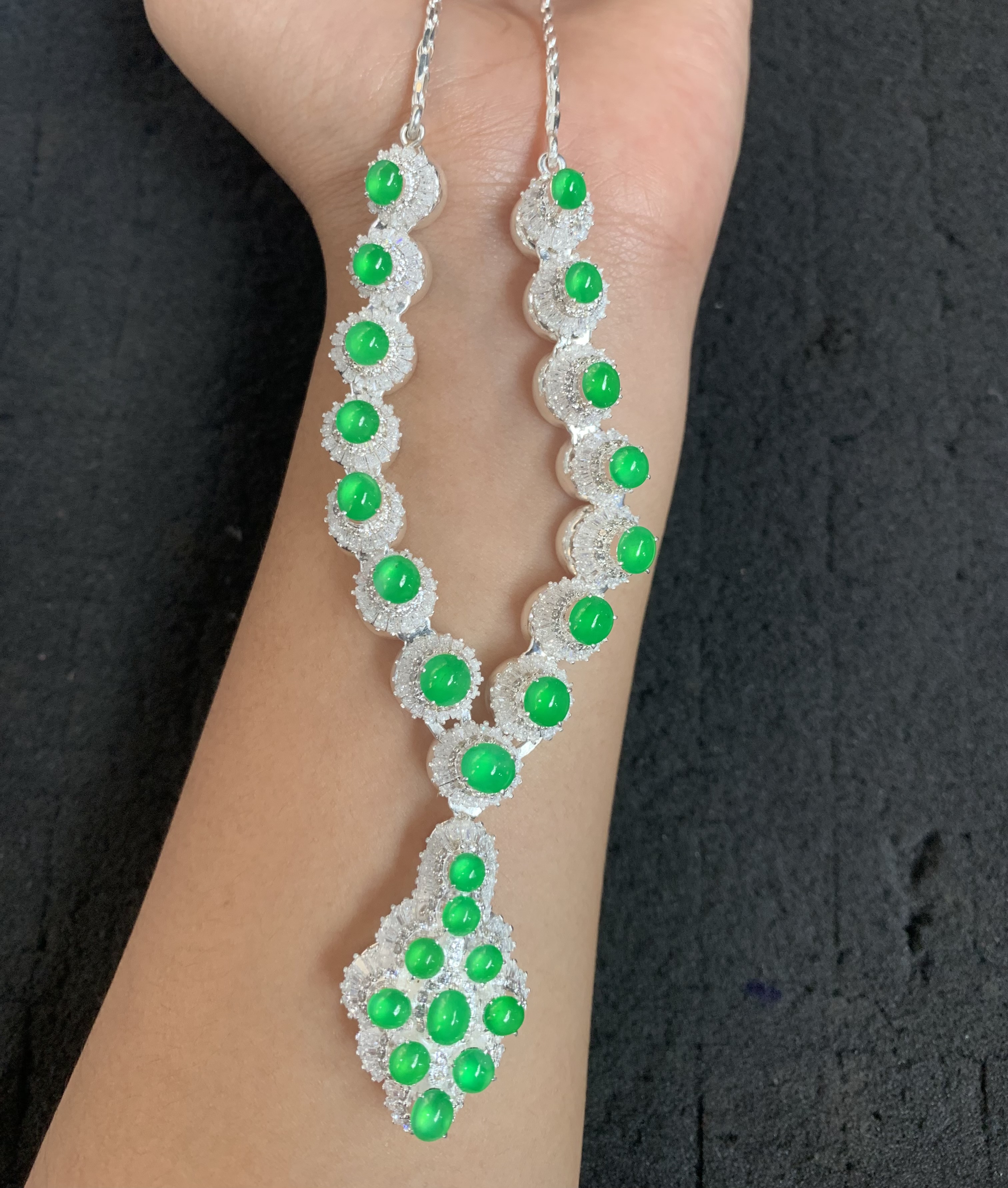 A stunning necklace featuring vibrant round green gemstones, each surrounded by sparkling clear accents set in silver-toned metal. The design showcases a symmetrical arrangement leading to an eye-catching teardrop-shaped pendant with clustered green stones, creating a luxurious and elegant look perfect for special occasions.