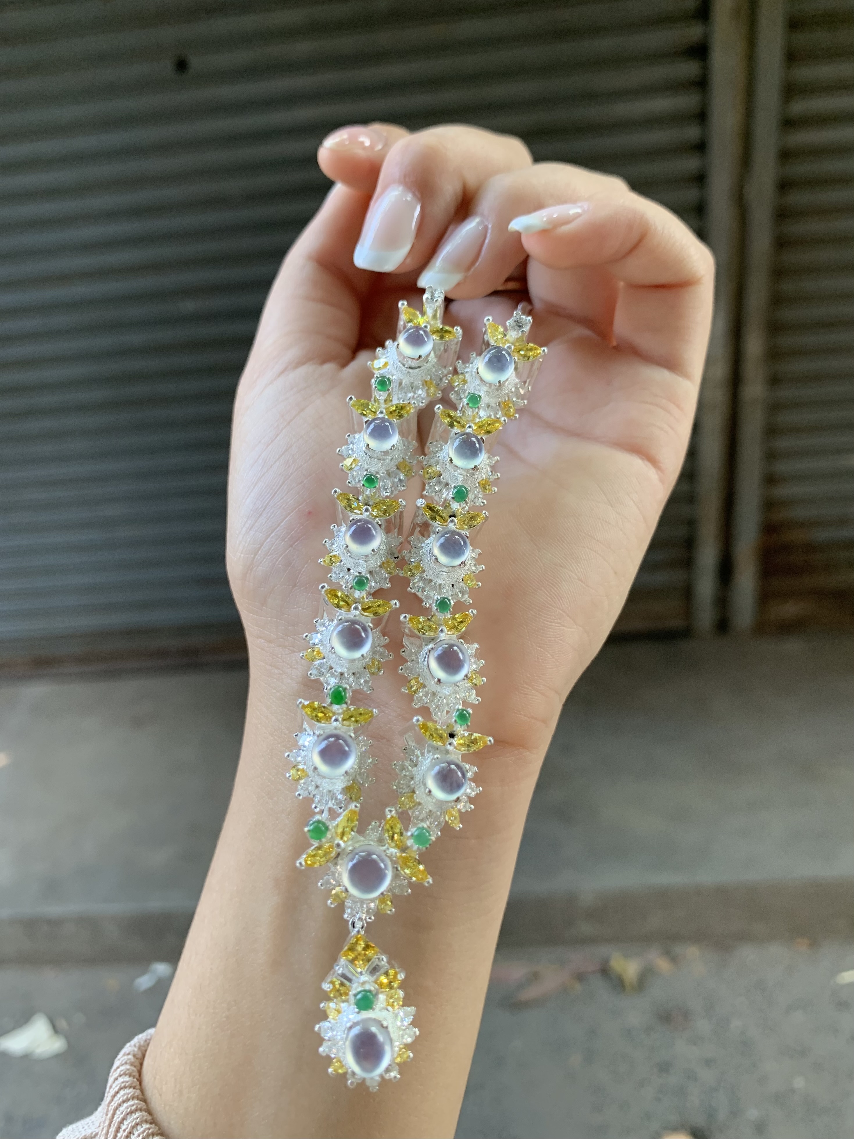 A dazzling bracelet showcasing multiple strands adorned with luminous round cabochon stones, complemented by sparkling yellow and green accent gems set in intricate silver-toned metal work. Held in a hand against an industrial-style background with a corrugated metal shutter, the piece exudes a luxurious and artistic charm, perfect for adding a striking touch to any ensemble.