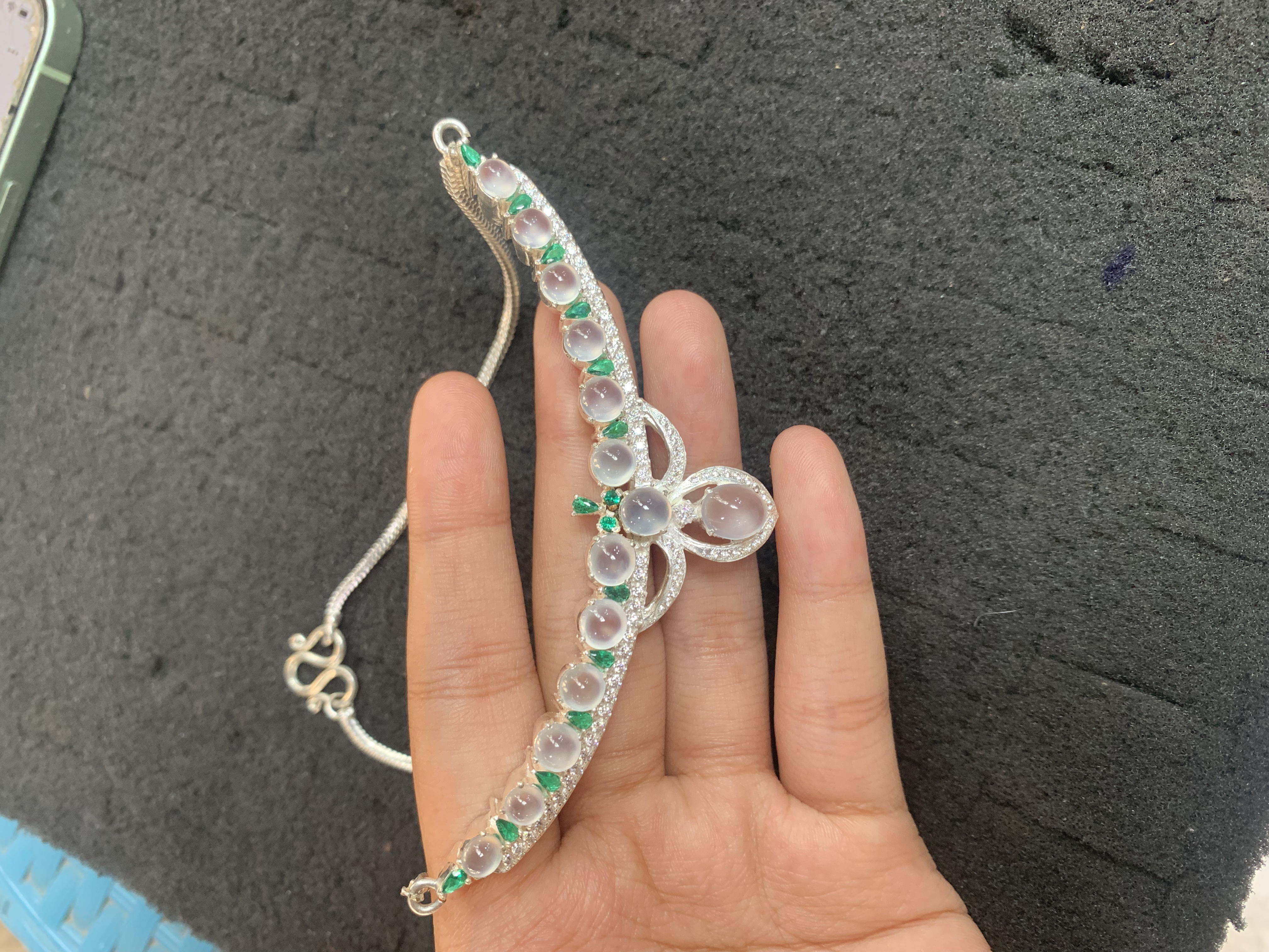 This stunning statement necklace showcases a curved, elegant design centered with two oval-shaped translucent jade stones set in intricate metalwork. The band is lined with round translucent jade beads, complemented by vibrant green gem accents and shimmering clear stones that add brilliance and depth. Crafted with meticulous detail, it features a sleek chain and secure clasp, making it a luxurious accessory perfect for formal events or as a standout piece to elevate special occasion attire