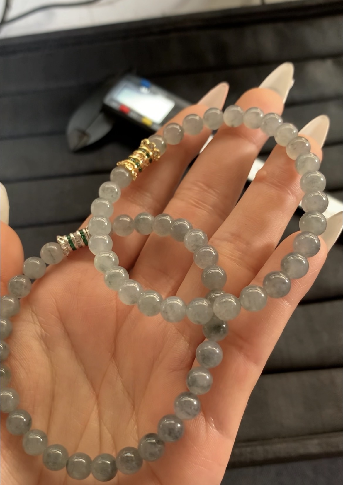 These are stylish bracelets made of round gray jade beads, exhibiting subtle natural variations in tone and translucency. Each bracelet features an intricately designed clasp adorned with small green and gold accents, adding a touch of elegance to the understated, sophisticated look. The smooth, polished beads highlight the unique texture of the jade, making them ideal for daily wear or as a refined addition to any jewelry collection