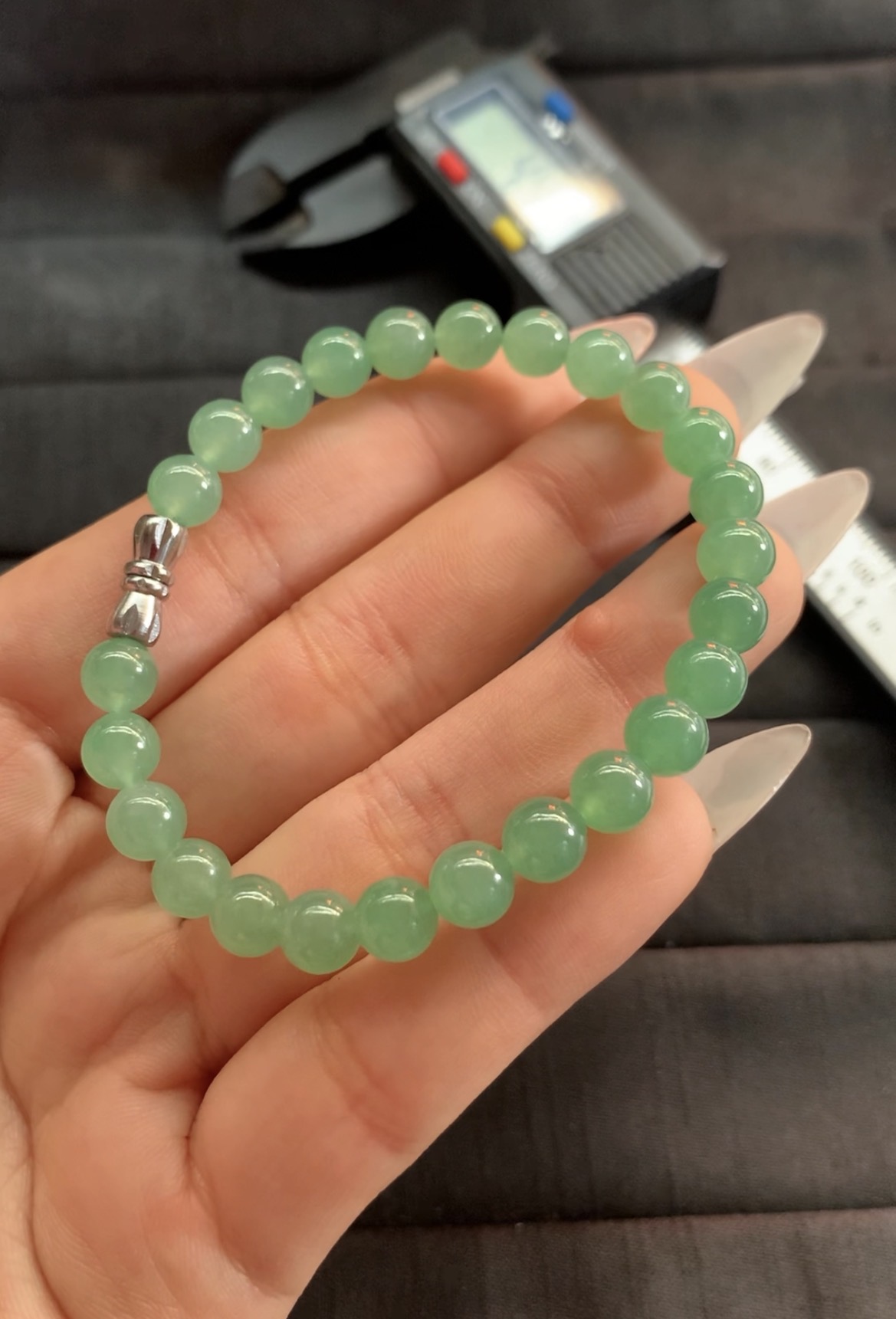 This charming bracelet showcases smooth, round green beads with a gentle luster, resembling green aventurine. The beads are evenly sized and strung to form a comfortable fit, finished with a sleek silver-toned clasp for easy wearing and secure closure. A lovely accessory that brings a fresh, natural touch to any ensemble.