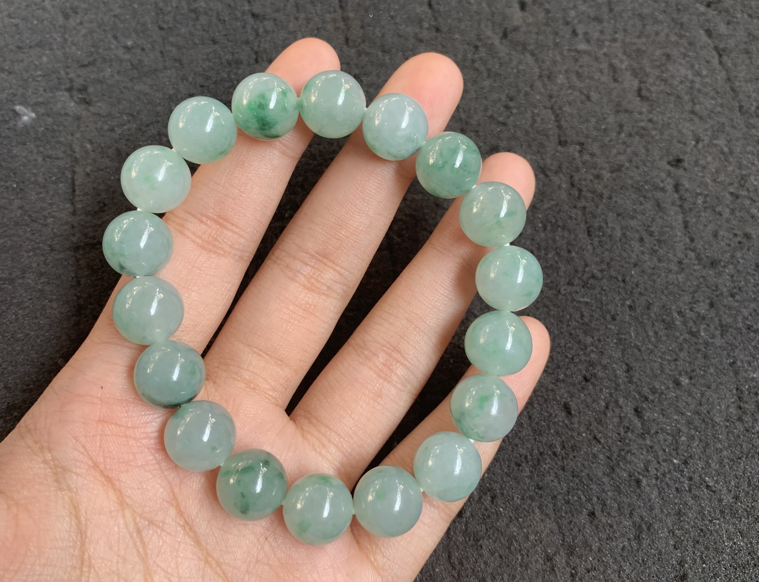 This bracelet is crafted with round, translucent jadeite beads featuring natural green cloud-like patterns and subtle color variations. Designed as a stretch style for easy wear, each bead has a smooth, polished surface that highlights the stone's inherent luster. The unique veining makes it a distinctive piece, perfect for adding a touch of natural elegance to everyday outfits or as a meaningful gift for jade enthusiasts.
