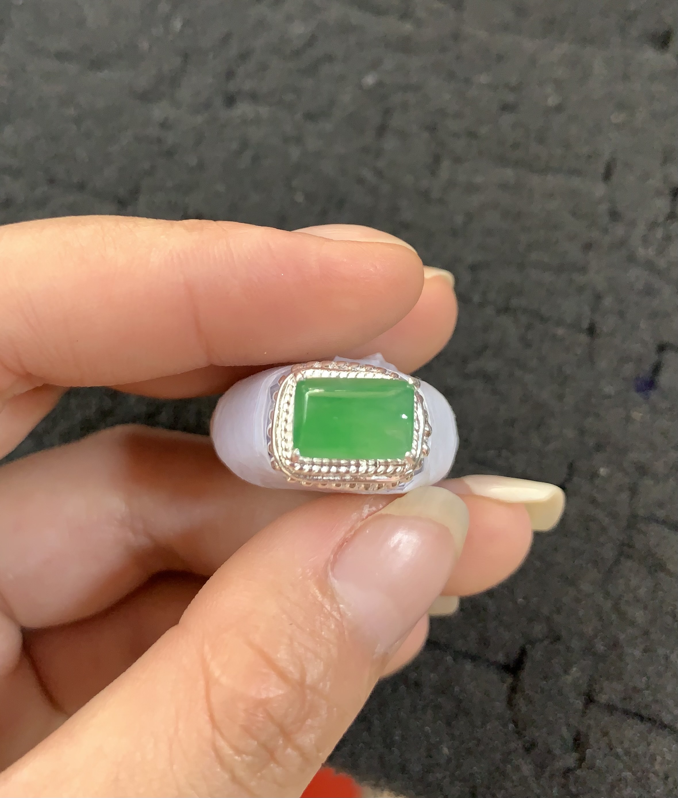 Green Jadeite Rectangular Cabochon Ring with White Band