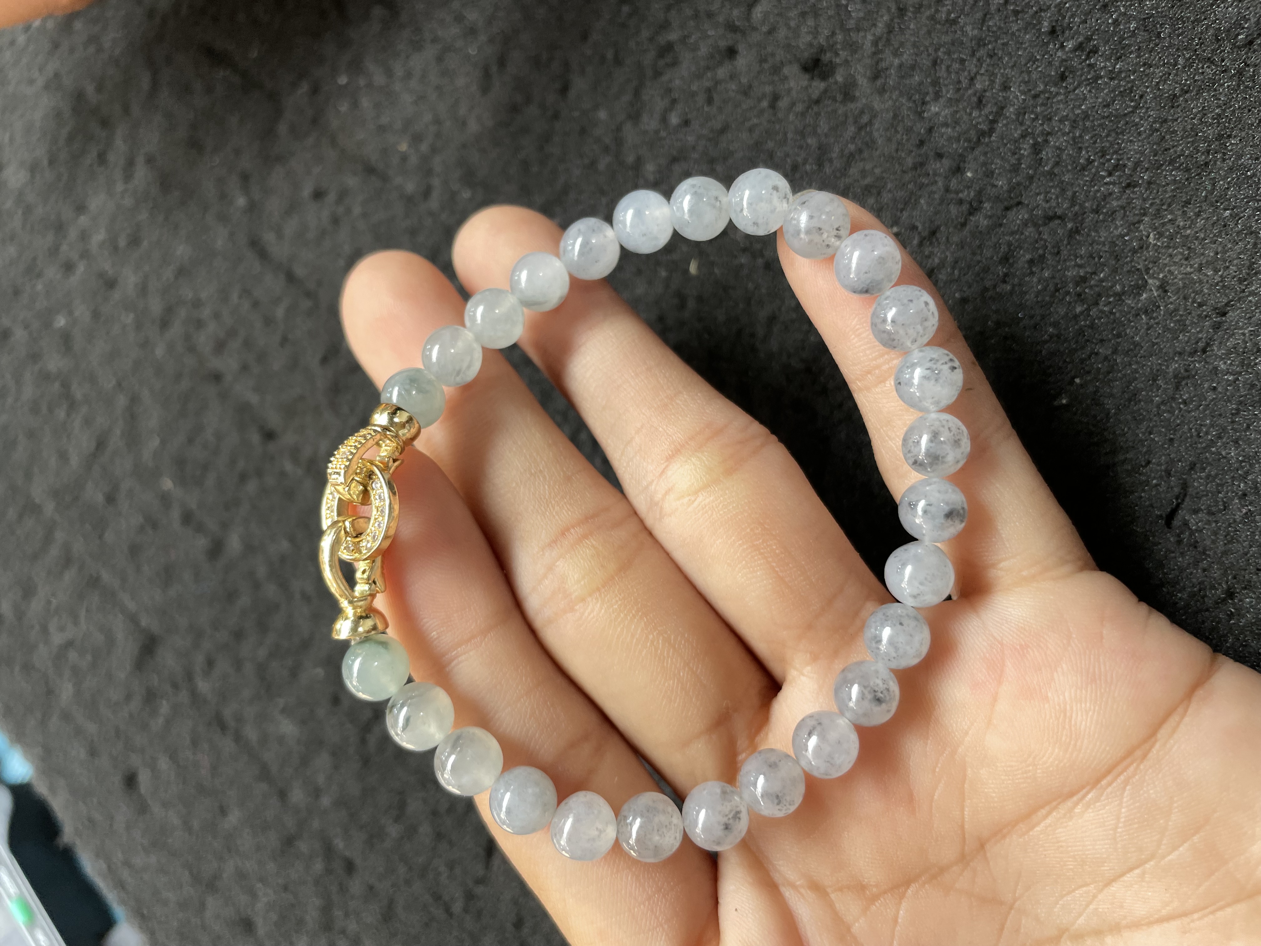 This sophisticated bracelet features round jadeite beads with a unique grey-speckled translucent finish, complemented by a small light green jadeite accent bead. It is fitted with an intricately detailed gold-toned clasp, combining natural gemstone character with refined craftsmanship. A stylish accessory suitable for both everyday wear and special occasions.