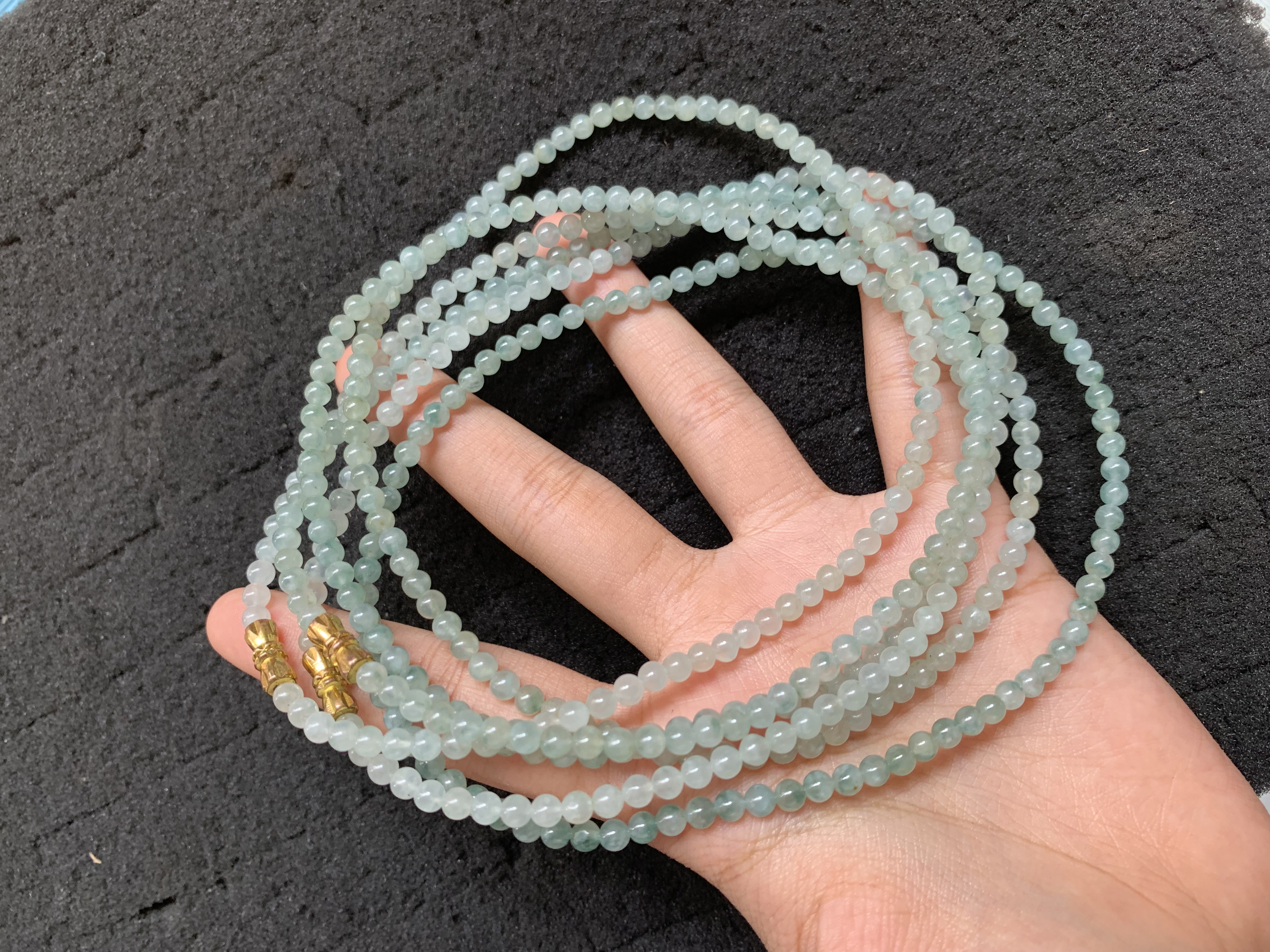 This elegant necklace is crafted from a long strand of perfectly round jade beads, showcasing a beautiful pale greenish-blue hue with excellent translucency and a smooth, polished finish. The beads are uniform in size and clarity, creating a soft, luminous effect that highlights the natural beauty of the stone. It is finished with high-quality gold clasps and connectors that add a touch of luxury and make it easy to wear or adjust the length. In Chinese culture, this type of jade is believed to bring peace, clarity, and positive energy, making this piece both a sophisticated accessory and a meaningful talisman.