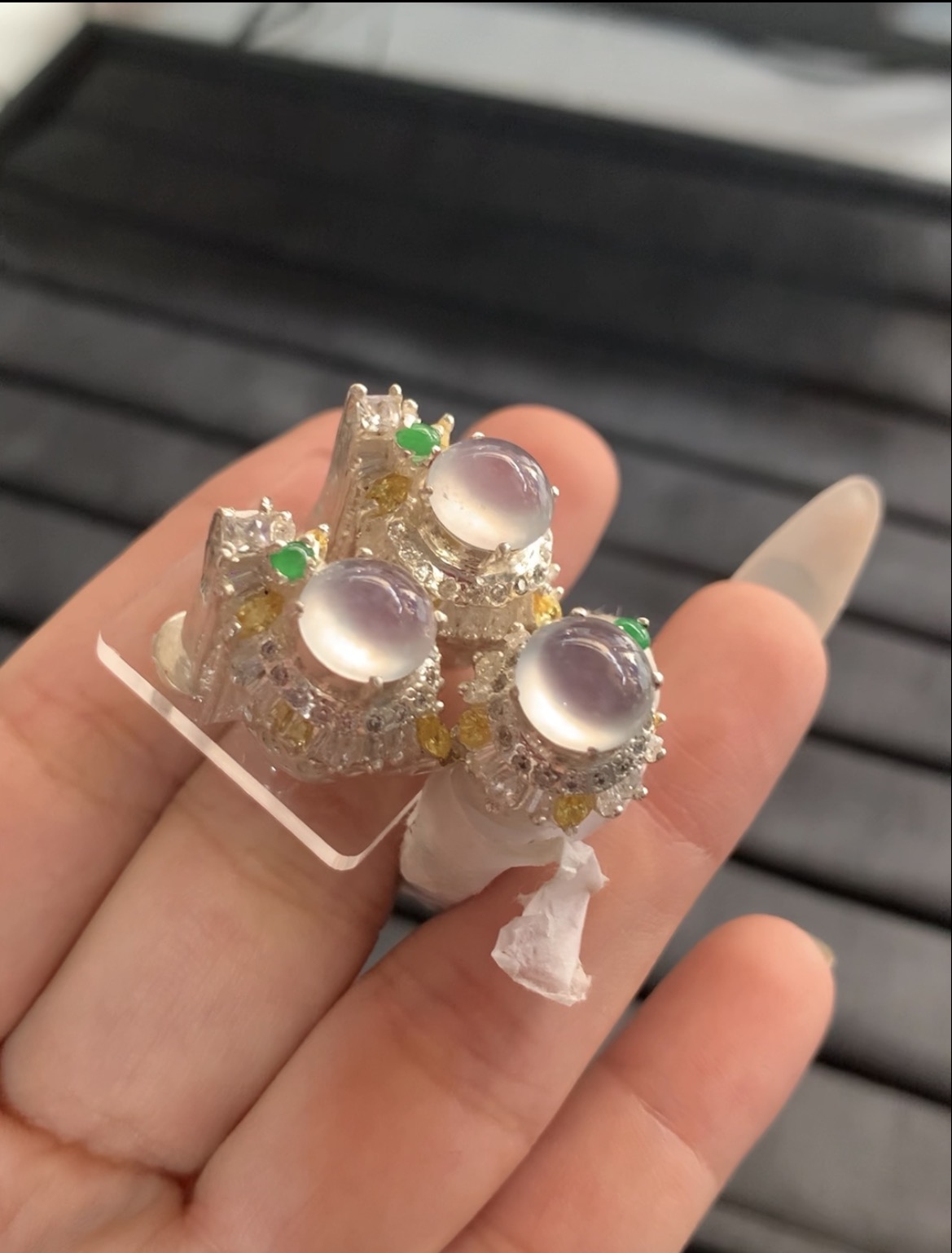 This stunning collection features matching rings and pendants, each centered with high-quality icy jadeite stones. The jade boasts exceptional translucency and a pale, luminous hue that resembles pure water, shaped into smooth round cabochons. They are beautifully accented with small, vibrant green jade stones and bright yellow gems, all set in intricate silver mountings heavily encrusted with sparkling clear stones. The combination of the luminous jade, colorful gems, and detailed floral-inspired craftsmanship creates a luxurious and unique design. In Chinese culture, jade symbolizes purity, harmony, and good fortune, making this set both a masterpiece of art and a meaningful talisman.