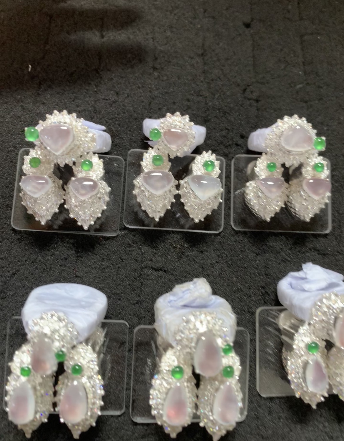 This stunning collection features a series of matching jewelry pieces, including rings and pendants, each showcasing high-quality icy jadeite stones. The jade boasts exceptional translucency and a pale, luminous hue that resembles pure water, shaped into elegant teardrop and heart-like cabochons. They are beautifully accented with small, vibrant green jade stones and set in intricate silver mountings heavily encrusted with sparkling clear stones. The combination of the luminous jade, bright green accents, and detailed craftsmanship creates a luxurious, floral-inspired design that is both bold and incredibly elegant. In Chinese culture, jade symbolizes purity, harmony, and good fortune, making this set both a masterpiece of art and a meaningful talisman.