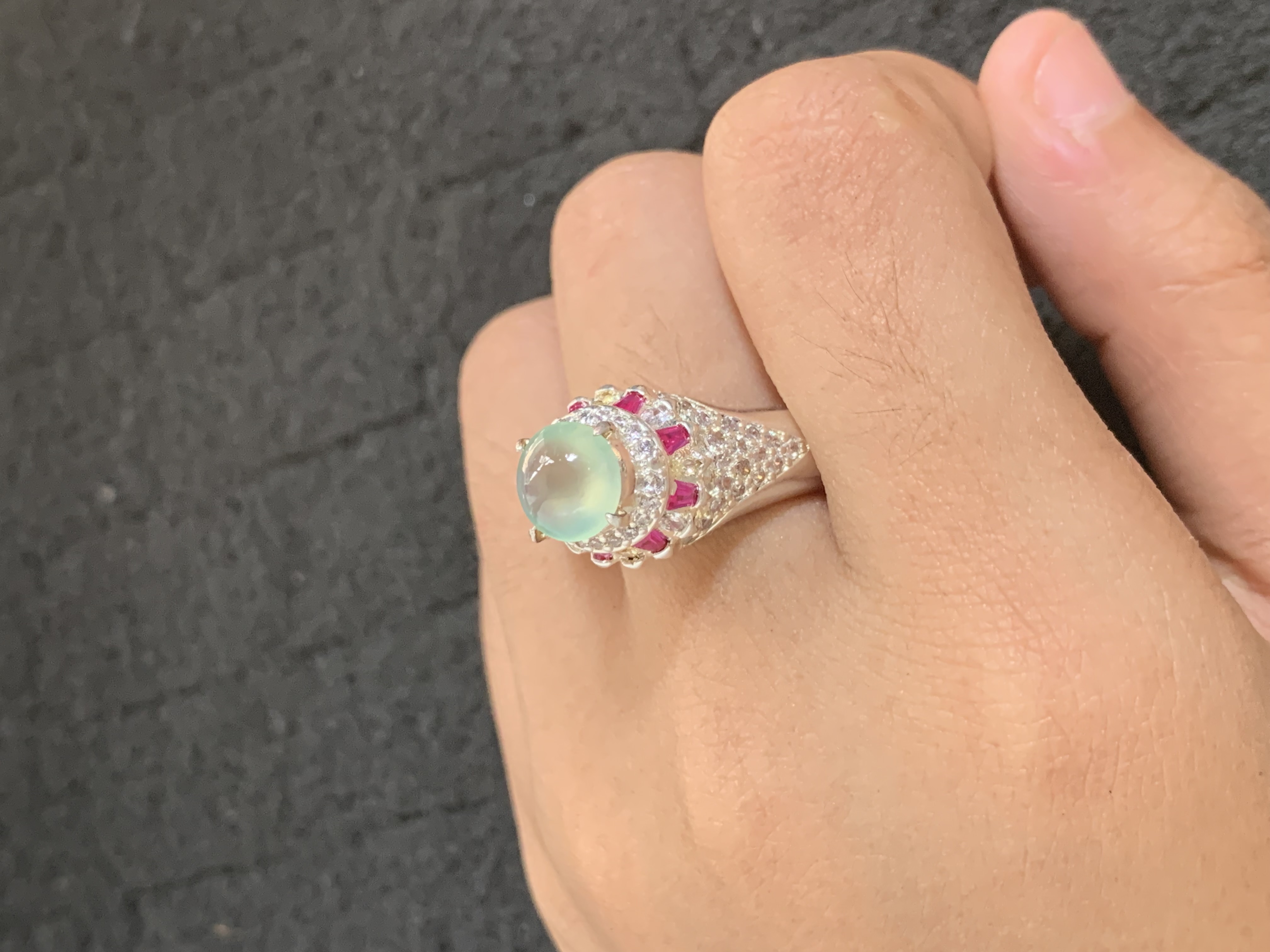 This exquisite ring features a high-quality icy jadeite stone at its center, boasting exceptional translucency and a pale, luminous greenish hue that resembles clear water. The stone is shaped into a smooth oval cabochon, showcasing its natural clarity and brilliance. It is elegantly set in a polished silver mounting, surrounded by a halo of sparkling clear stones and vibrant red rubies that create a striking color contrast and add layers of luxury. The band is also intricately encrusted with small stones, enhancing the overall sparkle and elegance. In Chinese culture, this type of jade symbolizes purity, harmony, and good fortune, making this piece both a stunning work of art and a meaningful talisman.