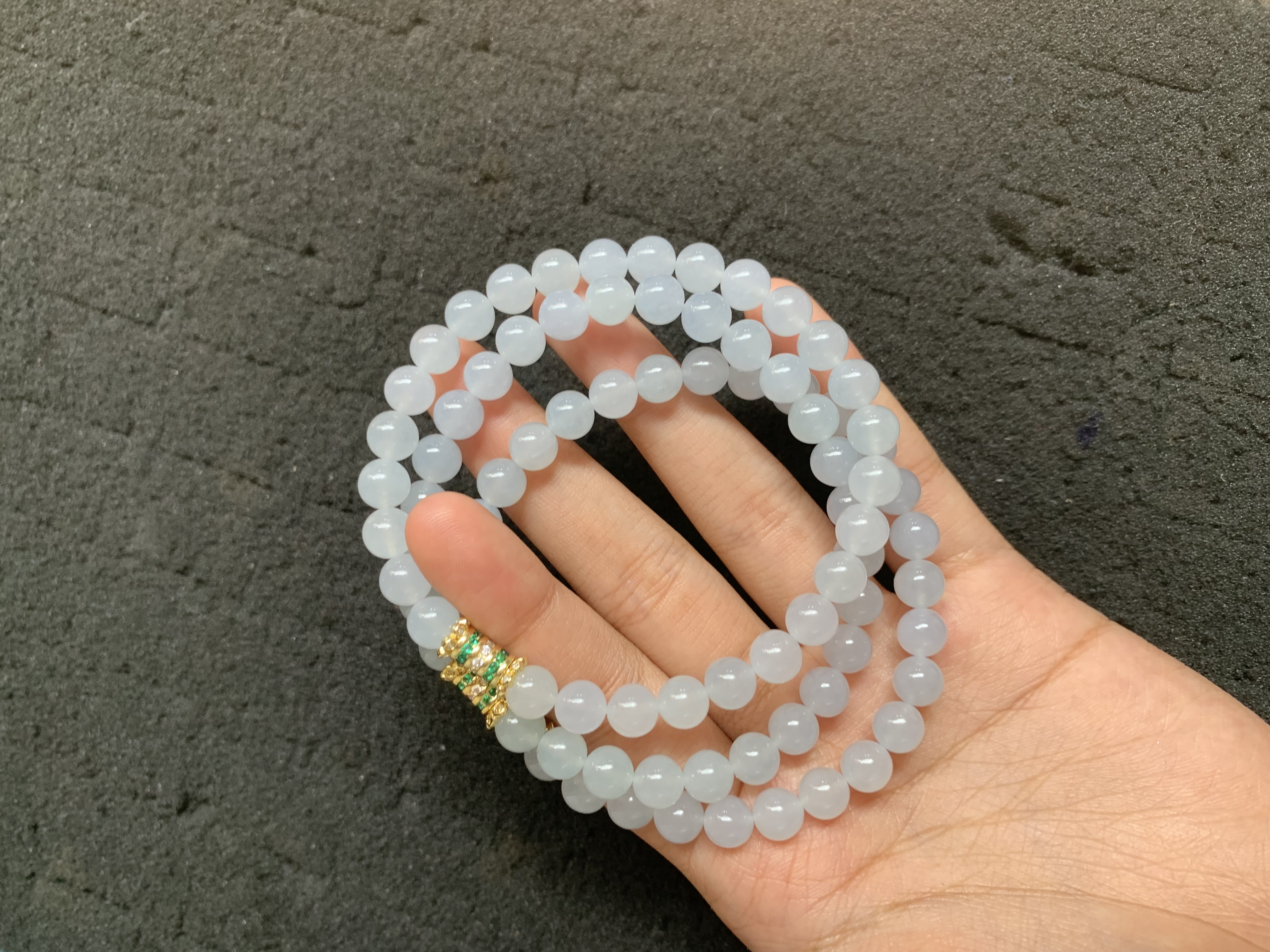 This elegant bracelet is crafted from perfectly round jade beads, showcasing a beautiful icy white hue with excellent translucency and a smooth, glossy finish. The beads are uniform in size and clarity, creating a soft, luminous effect that highlights the natural purity and texture of the stone. It is accented by a decorative gold spacer featuring small green and clear stones, adding a touch of contrast and luxury. In Chinese culture, white jade symbolizes purity, peace, and nobility, making this piece both a sophisticated accessory and a meaningful talisman.