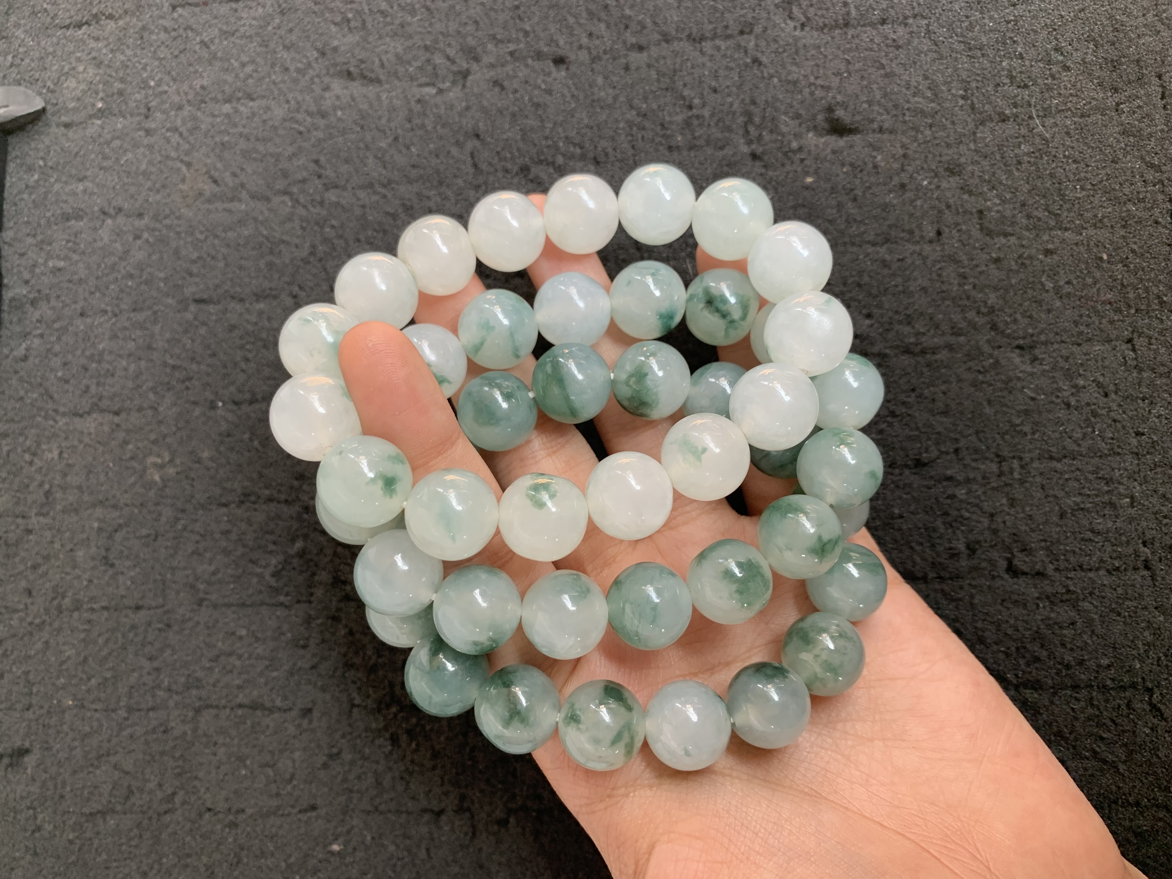 This collection features round jade-like beads in a base of pale white or light green, with natural-looking green veining or cloudy patterns throughout. The smooth, polished finish gives each bracelet a sleek and elegant appearance, making them ideal for both personal wear and gifting. They can be worn individually or stacked for a layered look.