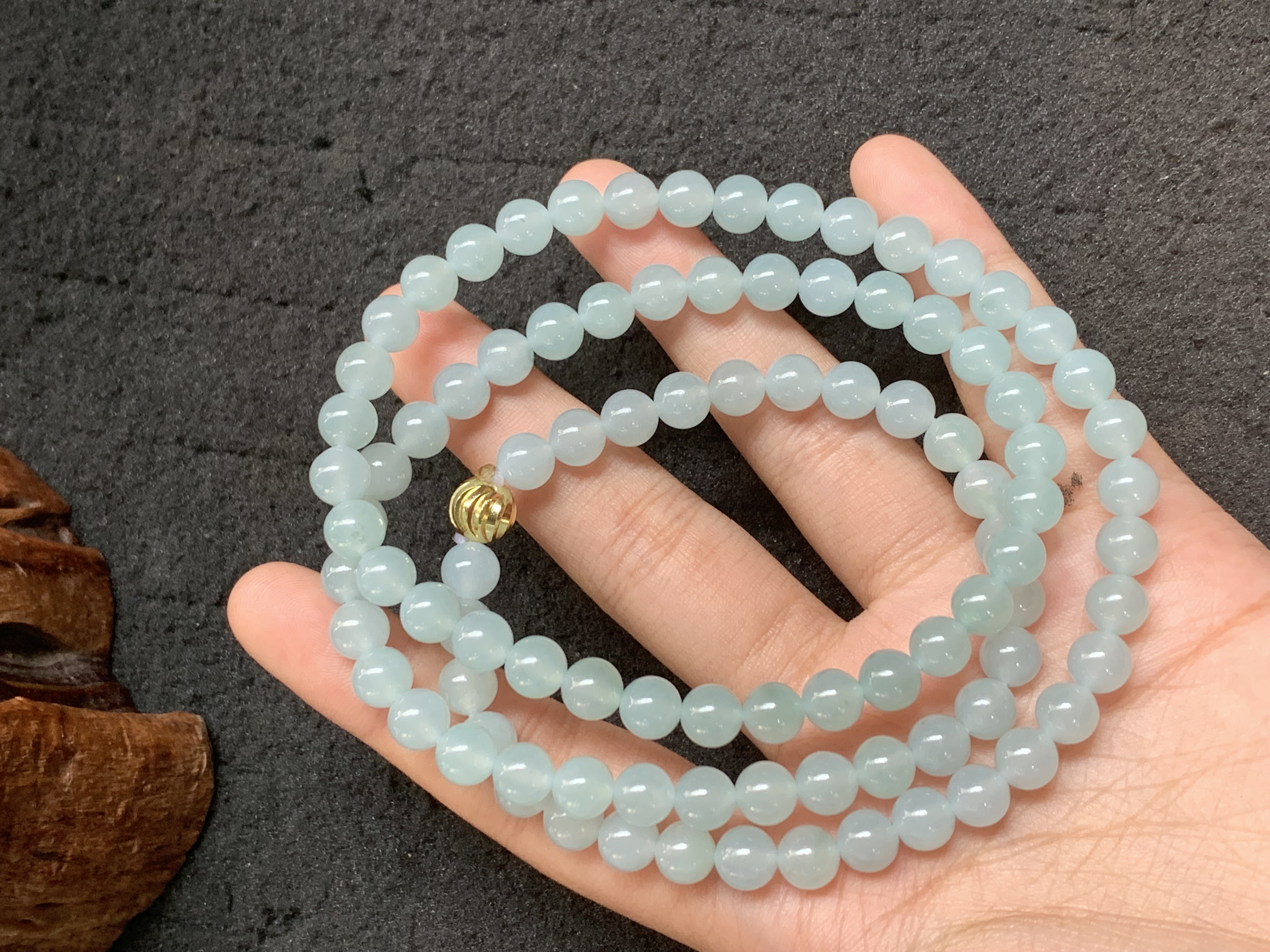 This piece features round, translucent light blue jade beads, strung together to form a versatile multi-loop accessory that can be worn as a bracelet or necklace. It is finished with a golden clasp, adding a touch of elegance to the delicate, natural beauty of the jade. The beads have a smooth surface and a subtle, soothing hue, making it a stylish addition to both casual and formal ensembles.