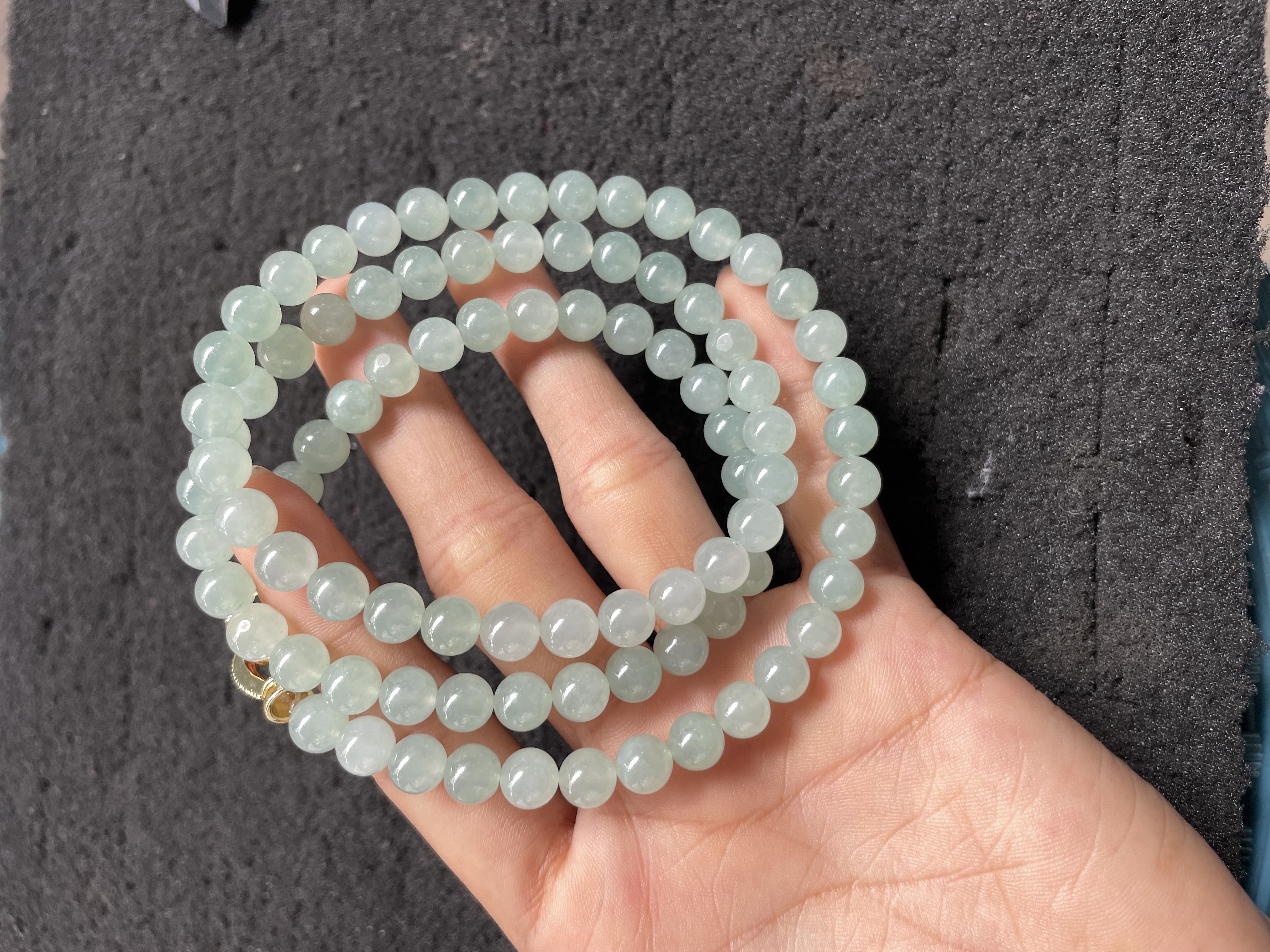 This versatile piece can be worn as a necklace or wrapped as a multi-strand bracelet. It features smooth, round light green jade beads with a subtle translucent quality, paired with elegant gold-tone connectors. The cool-toned jade gives a timeless, sophisticated look, perfect for both casual and formal occasions.