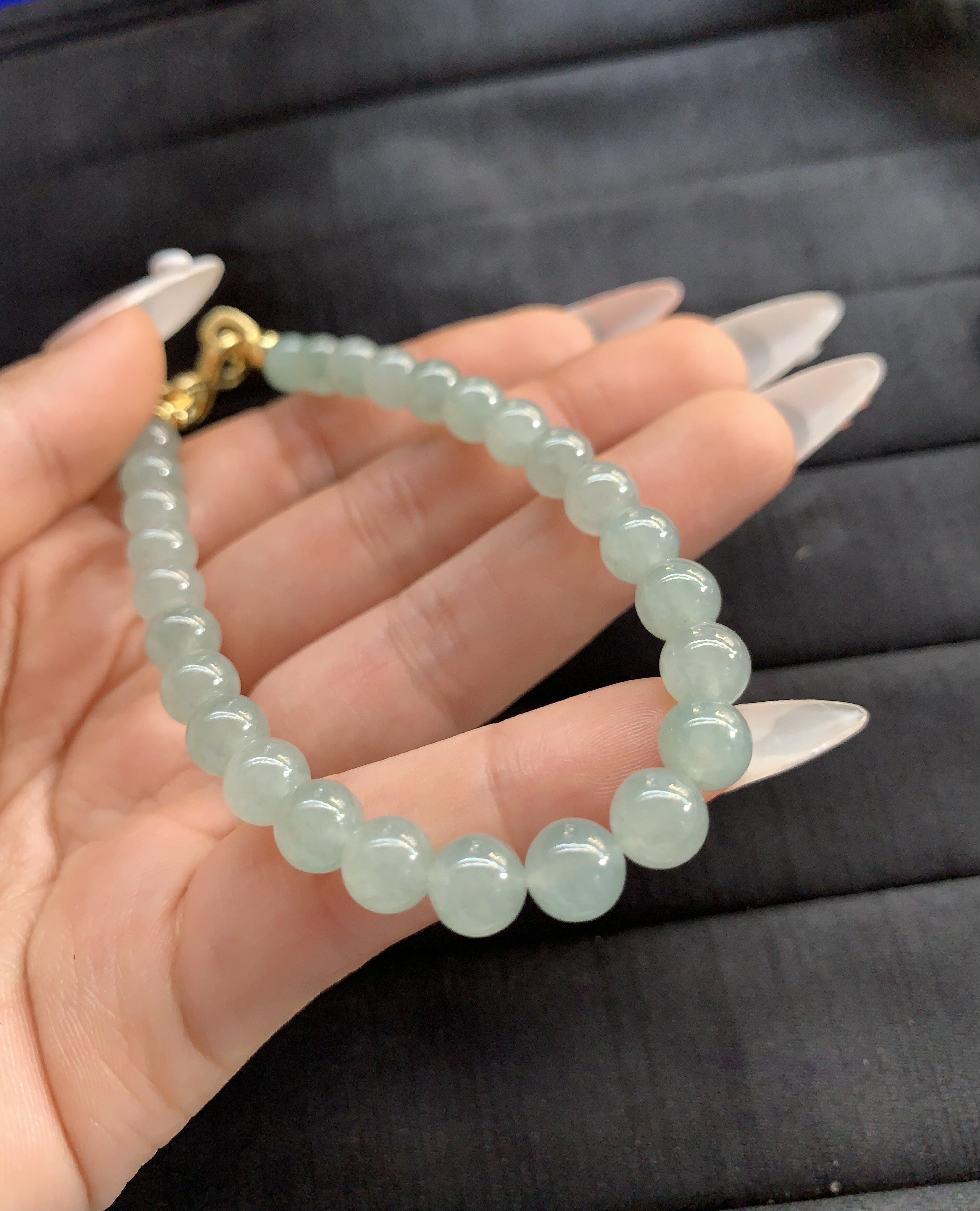 This delicate bracelet is strung with small, round light green jadeite beads that have a smooth surface and subtle translucency, offering a fresh and refined look. It features a gold-toned clasp for secure wear and easy adjustment, making it a chic accessory suitable for everyday styling or as a delicate gift for loved ones.