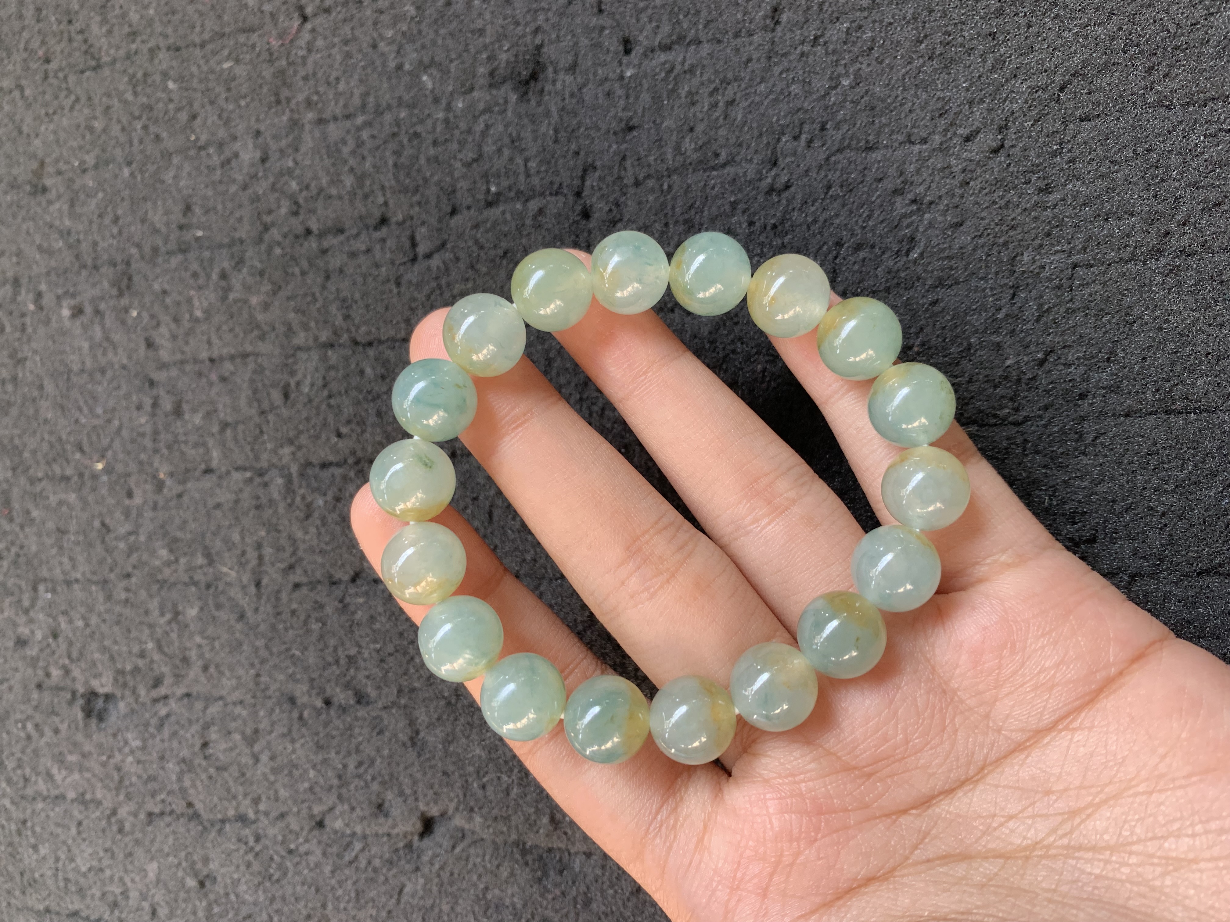This bracelet consists of round jadeite beads in a soft light green shade, featuring subtle natural veins that add unique character to each piece. The beads have a smooth surface and a gentle translucent quality, exuding a calm and elegant vibe. It is an ideal accessory for daily wear or as a meaningful gift.