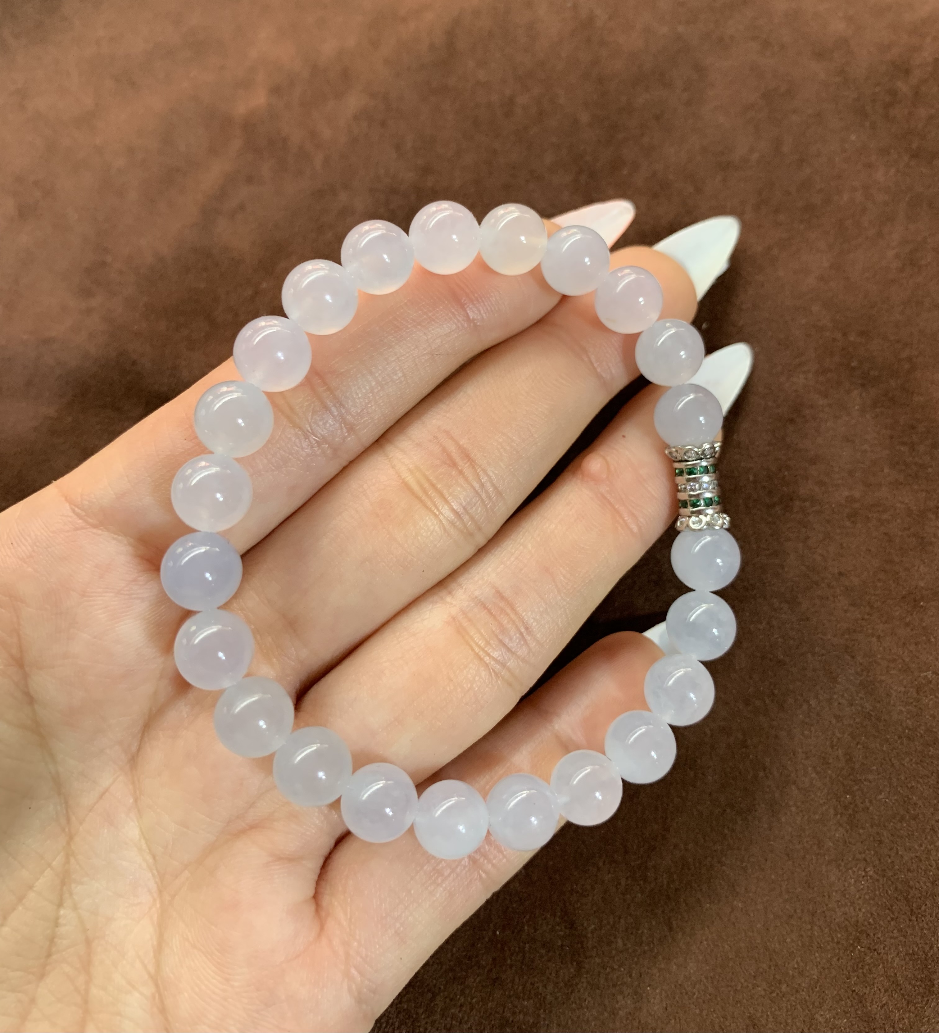 This delicate bracelet features smooth, round light lavender jade beads with a soft translucency and subtle color variations. It is accented by a decorative metal component inlaid with small green and clear stones, adding a hint of sparkle and elegance. The piece has a refined, versatile design perfect for everyday wear or to complement a polished look.