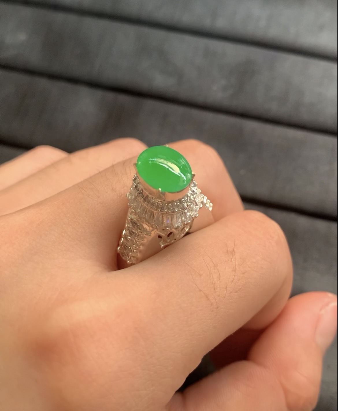 This stunning ring features a large, high-quality jadeite stone in a rich, vibrant green hue with excellent translucency and a smooth, glossy finish. The stone is shaped into a classic oval cabochon, showcasing its natural color and clarity to perfection. It is elegantly set in an intricate silver mounting heavily encrusted with sparkling clear stones, including both round and baguette cuts, creating a bold, crown-like design with intricate detailing on the band. The combination of the deep green jade and the brilliant accents makes this piece both timeless and incredibly eye-catching. In Chinese culture, green jade symbolizes vitality, harmony, and good fortune, making this both a masterpiece of craftsmanship and a meaningful talisman.