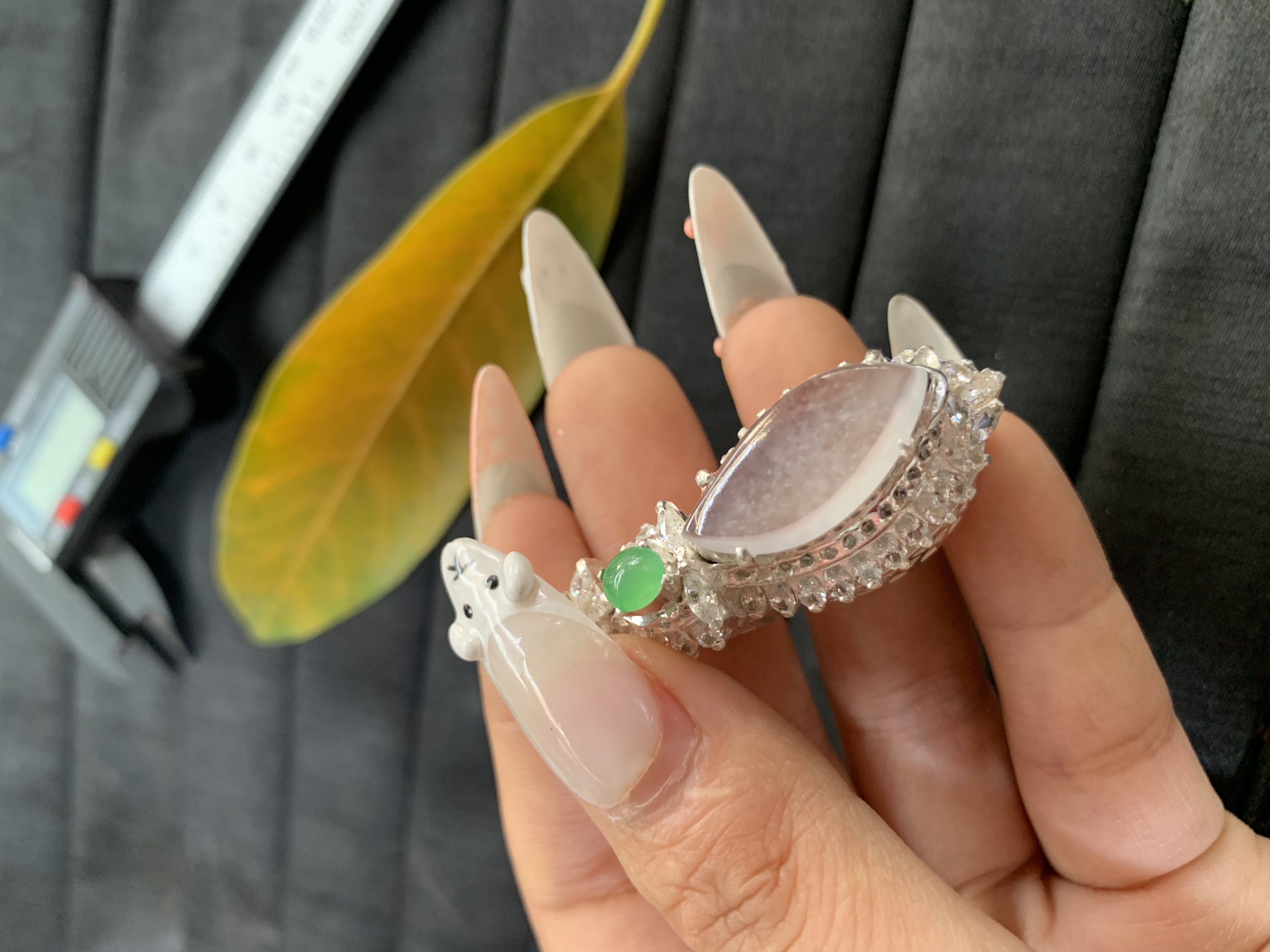 This elaborate ring features a marquise-shaped lavender jadeite as the centerpiece, with a smooth, translucent texture that showcases its delicate hue. The main stone is framed by a border of sparkling clear stones, and a small round green jadeite accent adds a striking pop of color. Crafted with intricate metalwork, the design blends elegance and artistry, making it a distinctive statement piece. Jadeite is revered for its symbolic meaning of balance and prosperity, while the unique shape and detailing ensure this ring stands out. Each piece is one-of-a-kind due to the natural variations in the jadeite, giving it exclusive charm and value.