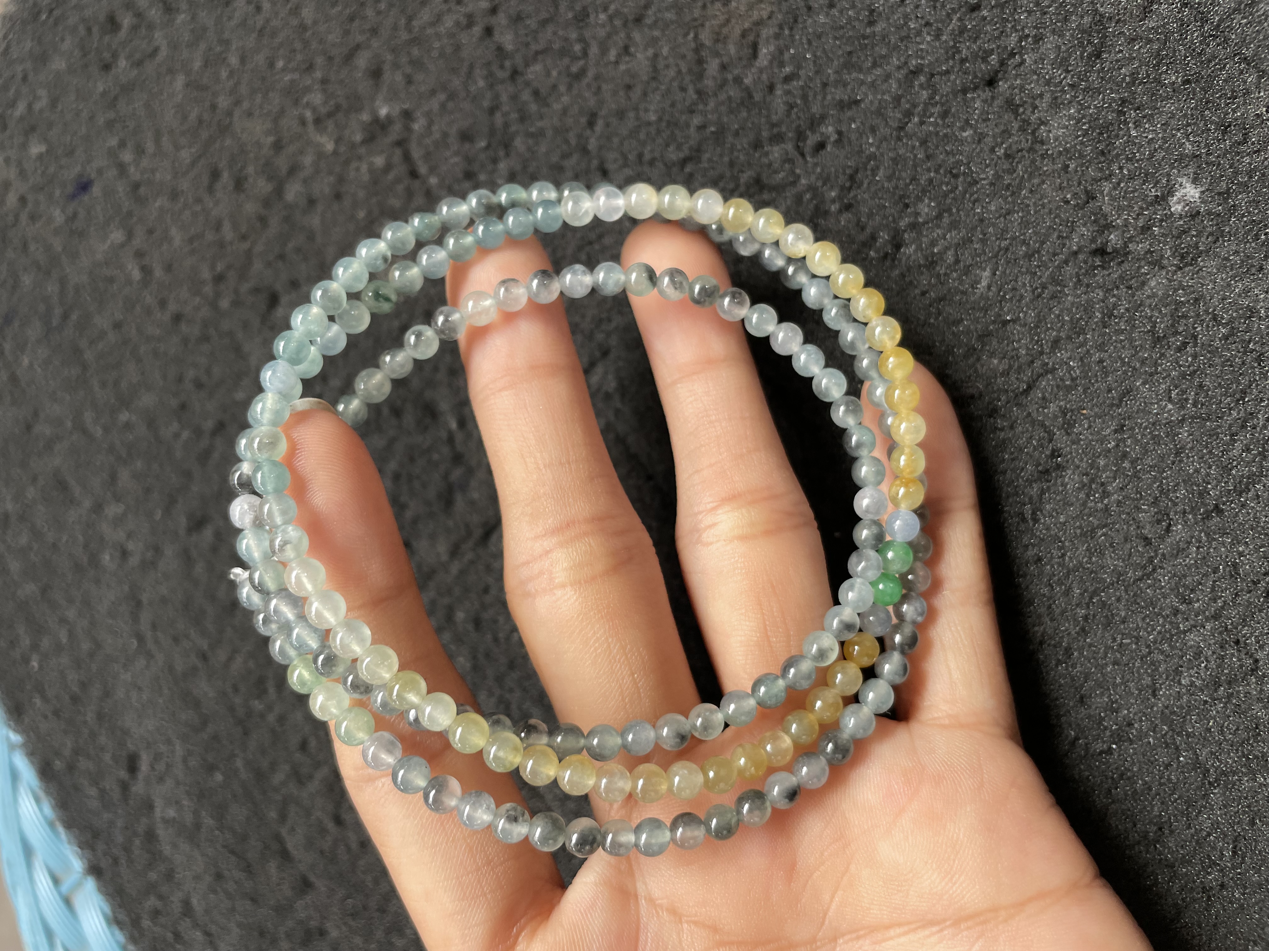This delicate multi-loop bracelet features small, round jade beads in a blend of soft hues including light blue-gray, pale yellow, and subtle green. The beads have a smooth, translucent texture, giving the piece an elegant and understated look suitable for daily wear or as a refined accessory to complement various outfits