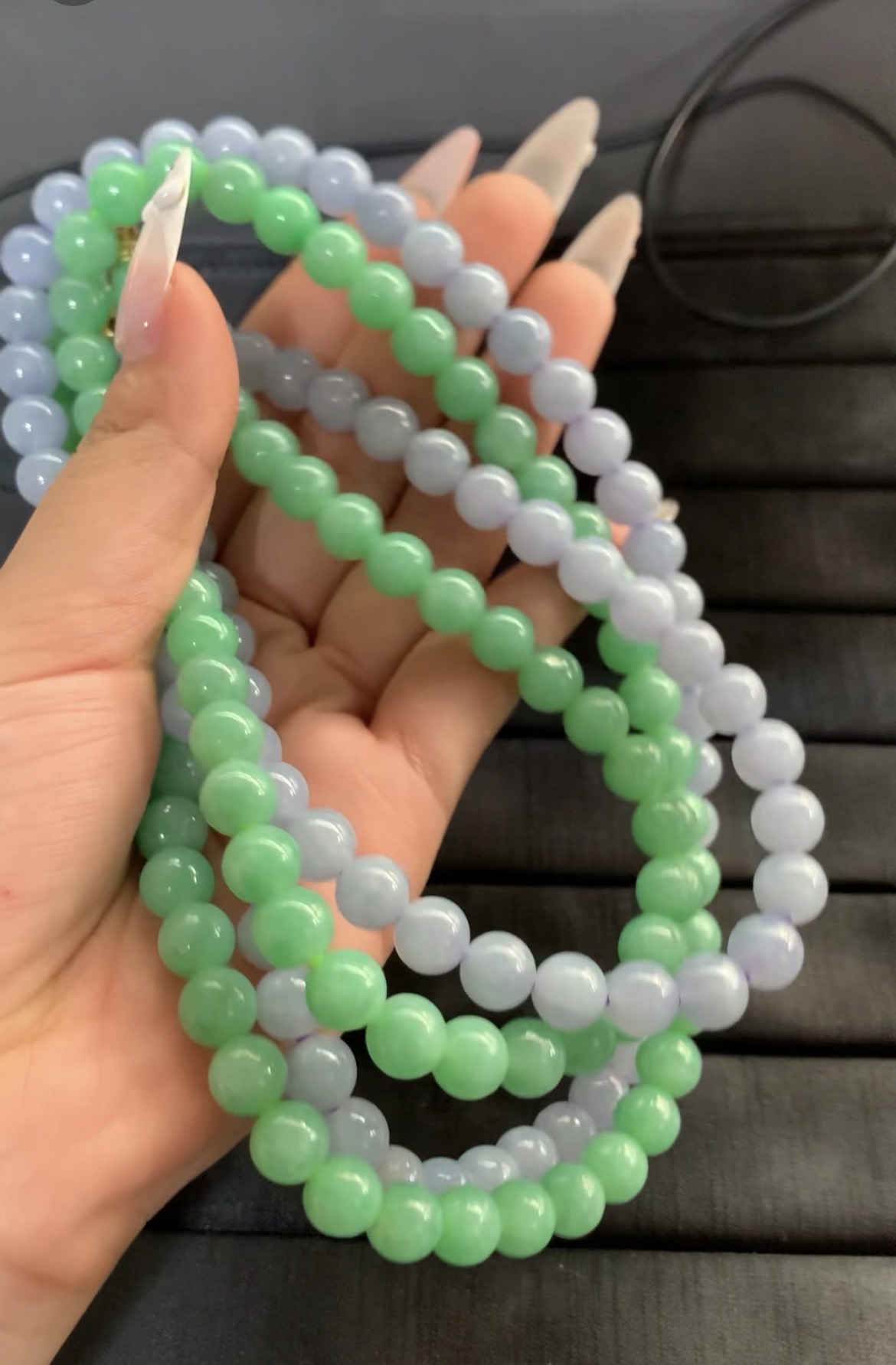 This versatile accessory features multiple strands of smooth round beads in soft green and delicate lavender hues. The beads have a gentle luster and consistent size, creating a harmonious look. It can be worn as a layered necklace or wrapped as a bracelet, making it a flexible addition to any jewelry collection. The fresh color combination brings a touch of elegance and charm to both casual and formal outfits.