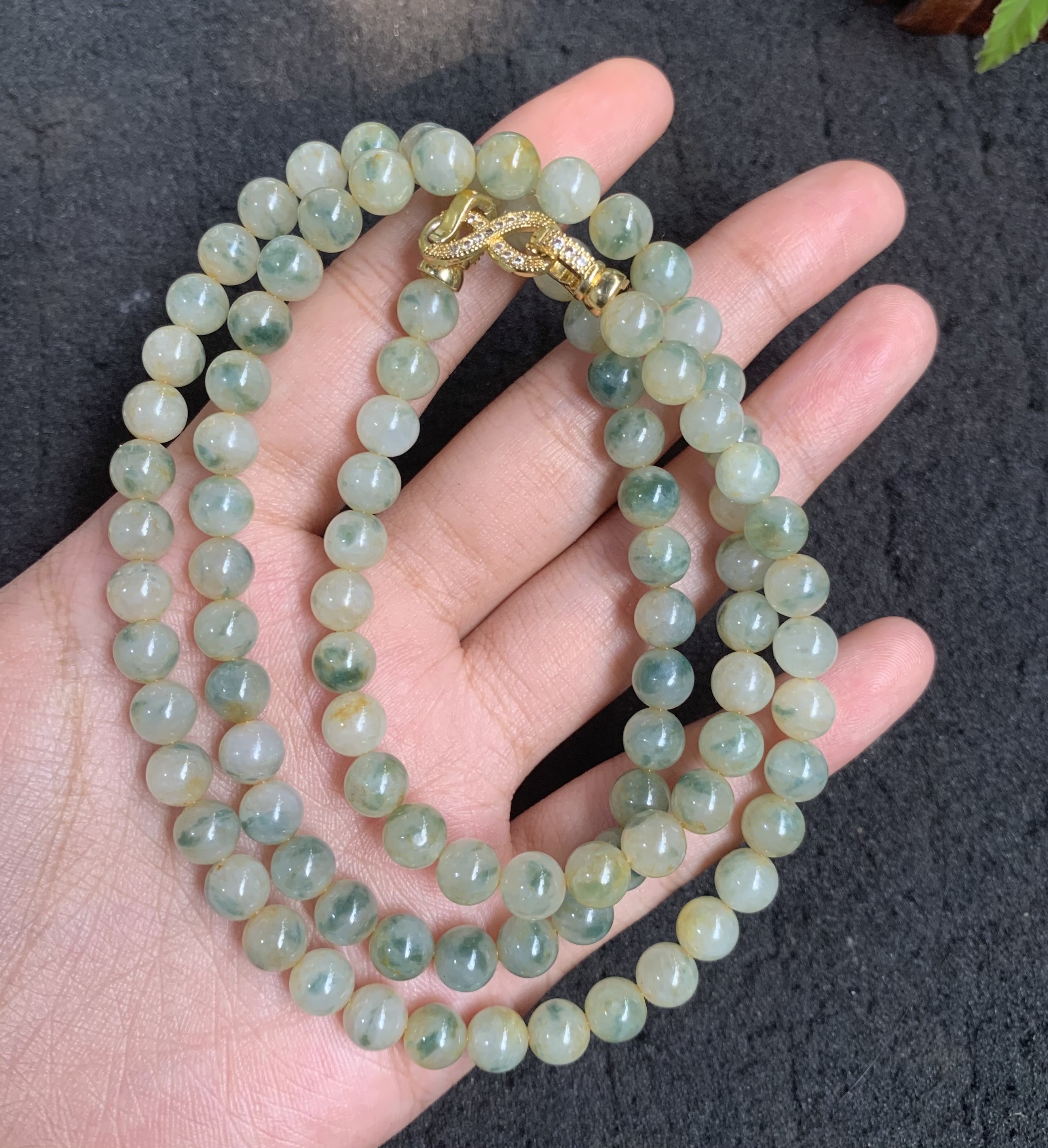 This exquisite necklace consists of multiple strands of round jadeite beads in soft shades of green with natural cloudy patterns and subtle color variations. The beads have a smooth, polished finish that highlights their translucent texture. It is fastened with an ornate gold-toned metal clasp featuring intricate detailing, adding a touch of luxury. Jadeite is highly valued in many cultures for its symbolic meaning of luck, protection, and harmony, making this piece a timeless accessory suitable for both casual and formal wear.