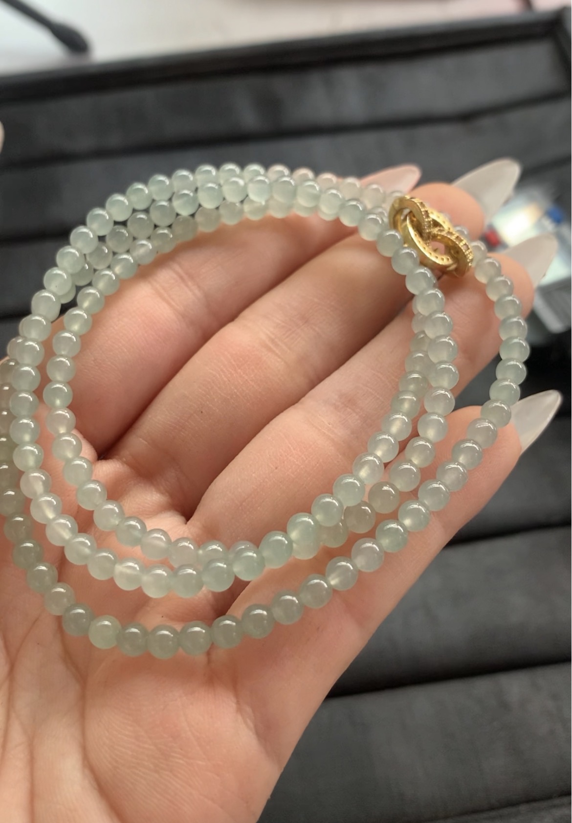 This sophisticated piece features multiple strands of tiny, round light green jade beads, each polished to a smooth, subtle sheen that highlights the stone's natural translucency. The uniform hue creates a cohesive, elegant look, while the delicate bead size adds a refined touch. A sturdy gold-toned clasp ensures secure wear and complements the soft green tones beautifully. Versatile in design, it can be worn as a layered necklace or wrapped as a bracelet stack, making it a timeless accessory suitable for various occasions.