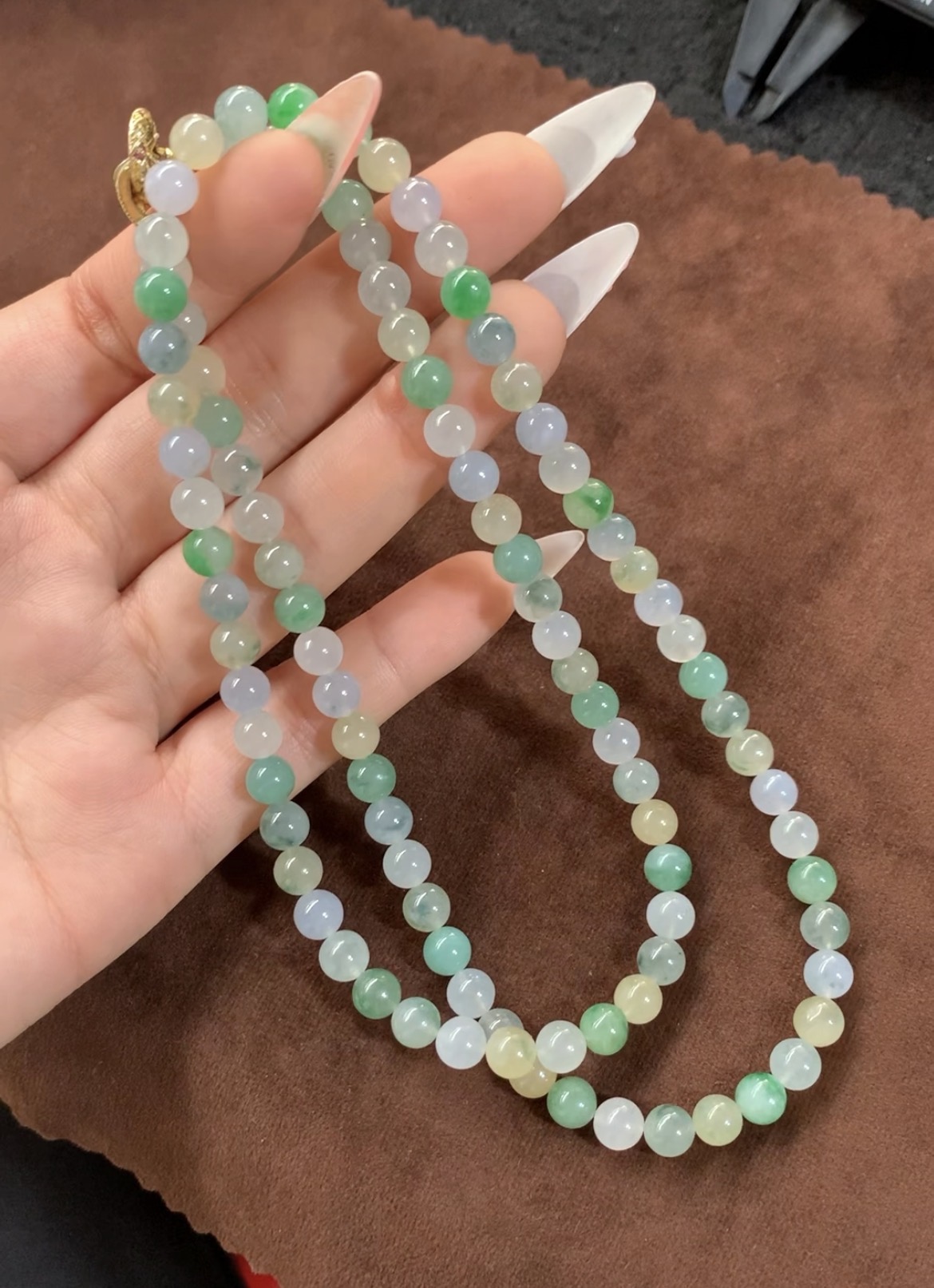 Colorful Multi-hue Jadeite Beaded Long Necklace with Gold-tone Clasp