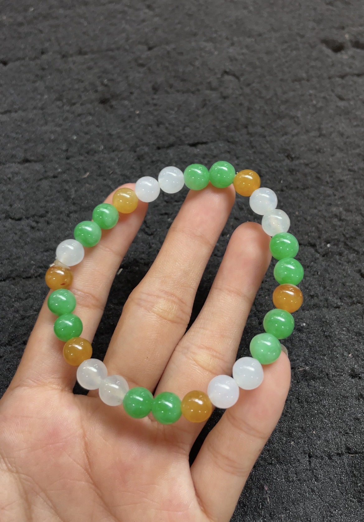 This vibrant bracelet features a harmonious blend of natural jade beads in three beautiful colors: vivid green, warm honey yellow, and pure icy white. Each bead is perfectly round, smooth, and polished to a glossy finish, showcasing excellent translucency and a luminous glow. The combination of bright and warm hues creates a lively and eye-catching look, while the uniform size ensures a comfortable and elegant fit. A cheerful and versatile accessory that celebrates the natural beauty and diversity of jade.