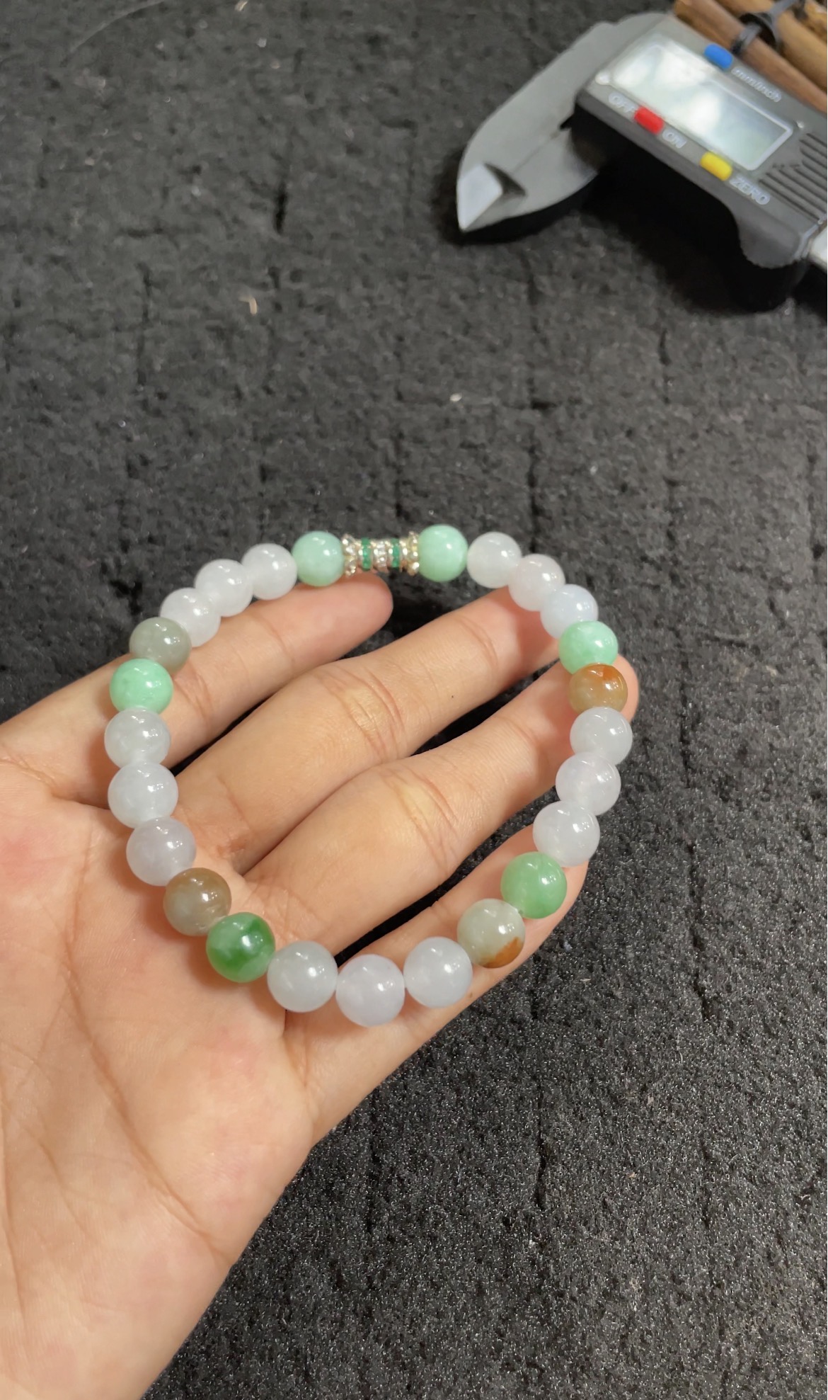 This vibrant bracelet features a harmonious blend of natural jade beads in a variety of beautiful colors, including pure icy white, fresh green, and warm honey yellow. Each bead is perfectly round, smooth, and polished to a glossy finish, showcasing excellent translucency and a luminous glow. A decorative silver spacer, intricately designed and accented with tiny green stones, adds a subtle touch of color and intricate detail. The combination of soft and warm hues creates a lively and eye-catching look, while the uniform size ensures a comfortable and elegant fit. A cheerful and versatile accessory that celebrates the natural beauty and diversity of jade.