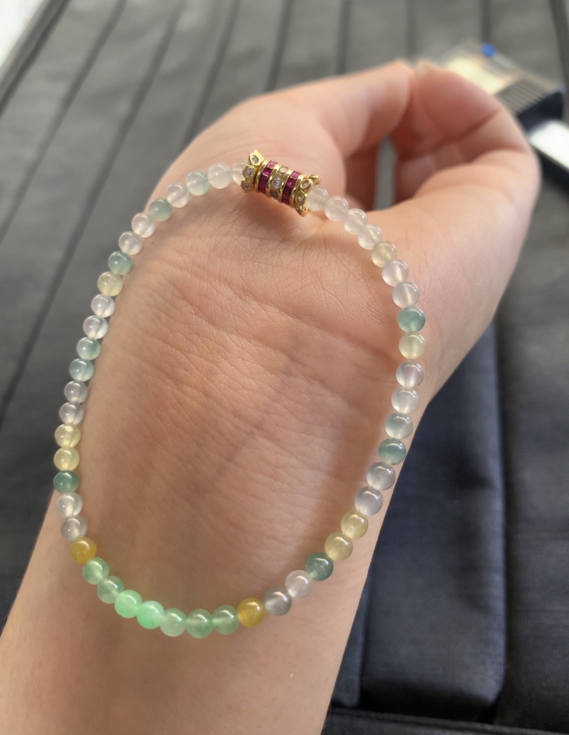 This delicate bracelet features tiny, perfectly round natural jade beads in a harmonious blend of fresh green, warm honey yellow, cool blue-green, and pure icy white hues. Each bead is smooth and polished to a glossy finish, showcasing excellent translucency and a luminous glow. A decorative gold spacer, intricately designed and encrusted with sparkling clear and red stones, adds a subtle touch of luxury and detail. The intricate arrangement of natural tones creates a lively yet elegant look, making it a timeless accessory that brings natural beauty and charm to any outfit.