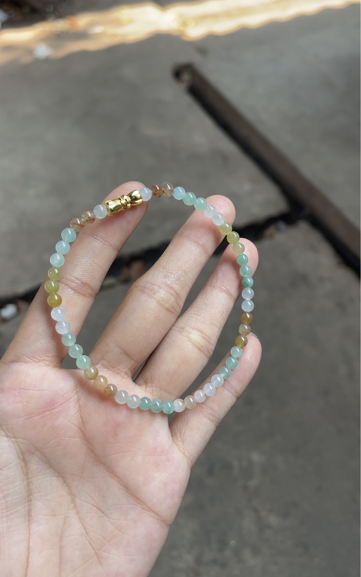 This delicate bracelet features a beautiful blend of natural jade beads in a harmonious palette of soft green, warm honey yellow, pure icy white, and subtle earthy tones. Each bead is perfectly round, smooth, and polished to a glossy finish, showcasing excellent translucency and unique natural textures that add depth and character. The combination of cool and warm hues creates a balanced and sophisticated look, while the ornate gold clasp adds a touch of classic luxury. Lightweight and comfortable to wear, it is perfect for adding a subtle pop of natural color and timeless charm to any outfit.