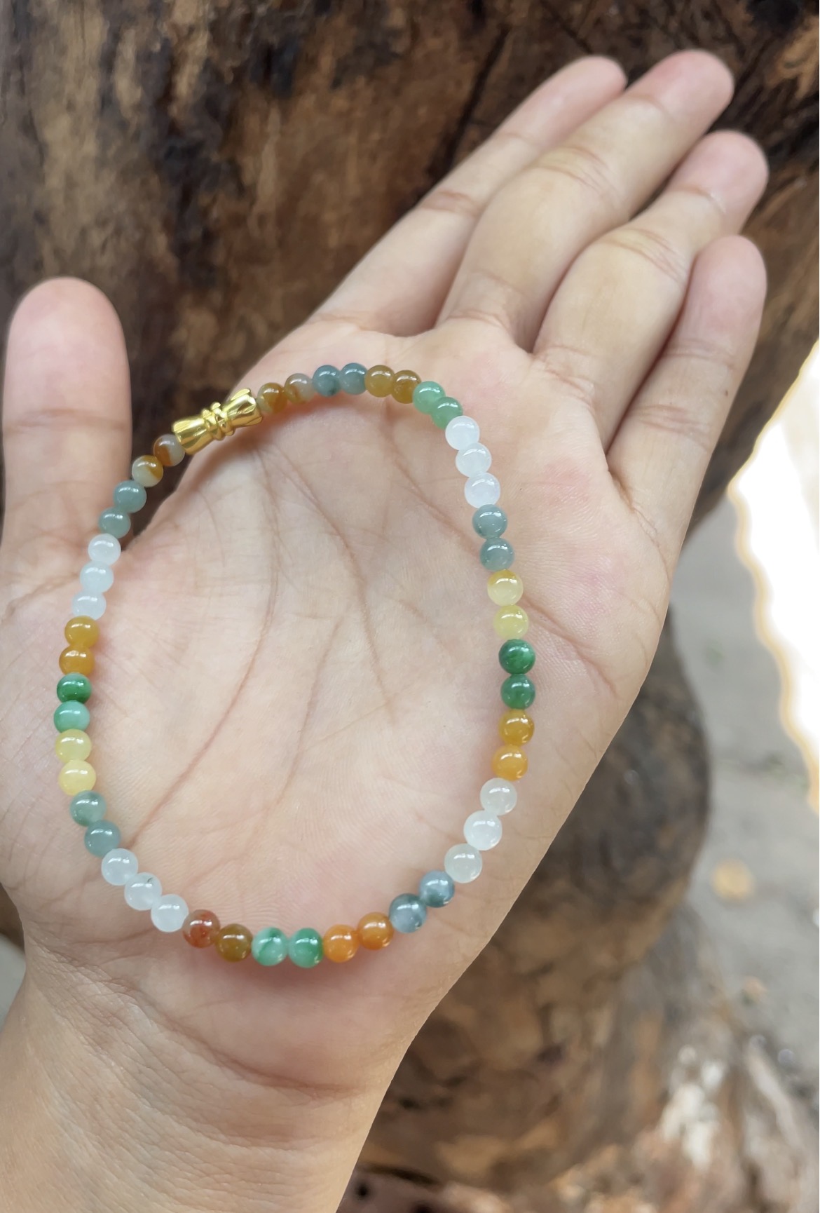 This vibrant bracelet features a stunning array of natural jade beads in a rich spectrum of colors, including vivid green, warm honey yellow, fiery orange-red, soft icy white, and deep blue-green. Each bead is perfectly round, smooth, and polished to a glossy finish, showcasing excellent translucency and unique natural textures that add depth and character. The harmonious blend of bright and warm hues creates a lively and eye-catching look, while the ornate gold clasp adds a touch of classic luxury. A cheerful and versatile accessory that celebrates the natural beauty and diversity of jade.