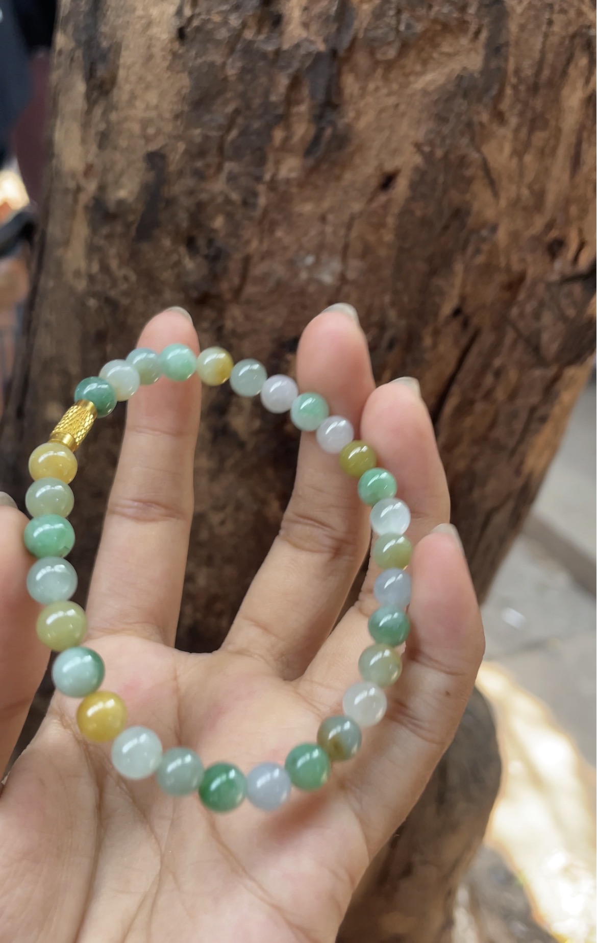 This elegant bracelet features a beautiful blend of natural jade beads in a harmonious palette of colors, including soft green, warm honey yellow, and pure icy white. Each bead is perfectly round, smooth, and polished to a glossy finish, showcasing excellent translucency and unique natural textures that add depth and character. A decorative gold spacer, intricately designed, adds a subtle touch of luxury and detail. The combination of cool and warm hues creates a balanced and sophisticated look, while the uniform size ensures a comfortable and refined fit. A timeless accessory that celebrates the natural beauty and diversity of jade.