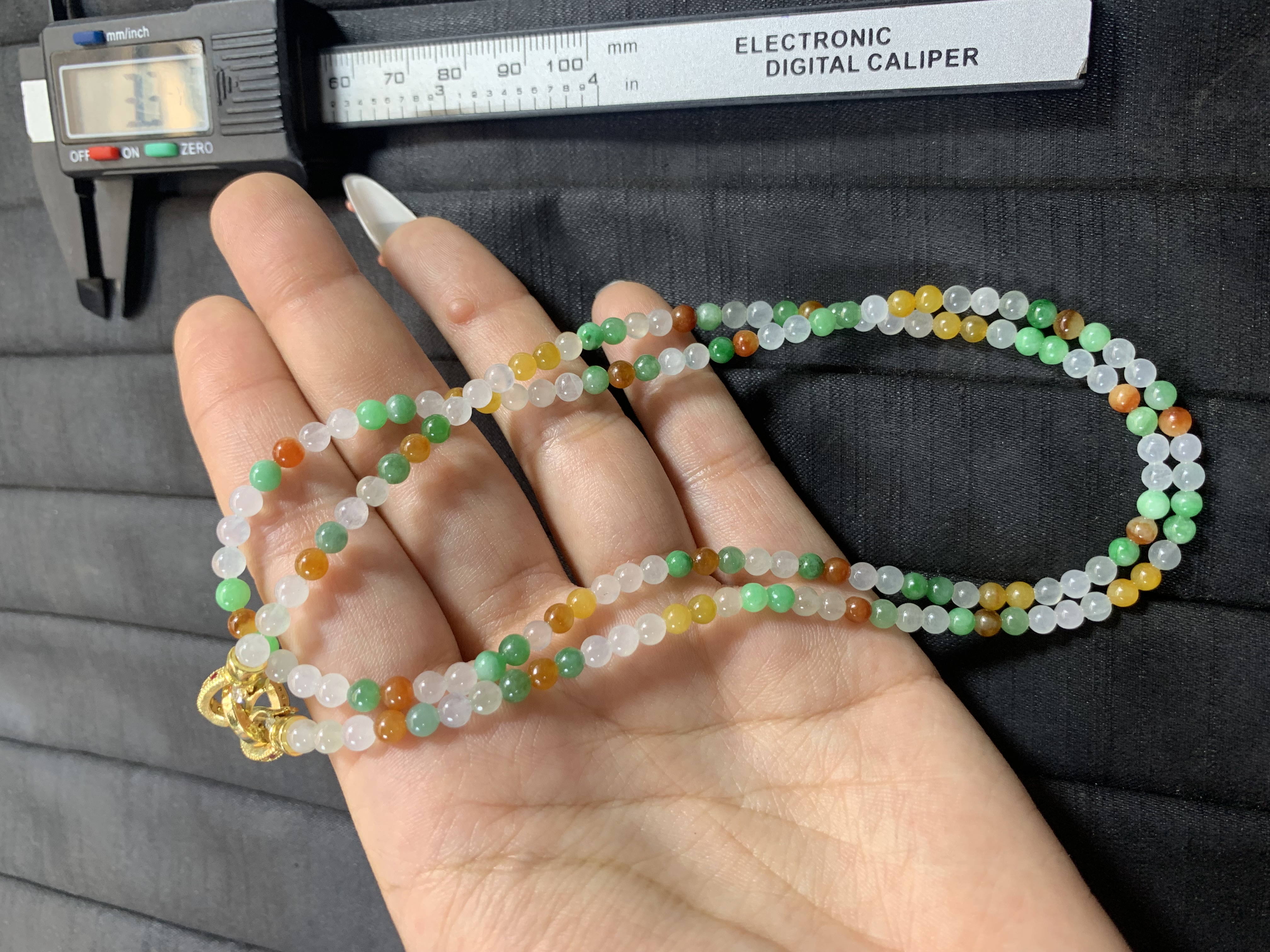 This stunning necklace features a harmonious blend of small, round natural jade beads in a vibrant array of colors, including fresh green, icy white, warm honey yellow, and rich orange-red. Each bead is smooth and polished, showcasing the unique natural beauty and translucency of jade. Strung together in an elegant design and finished with a gold clasp, this piece creates a lively and colorful look that is both eye-catching and versatile. Perfect for adding a touch of nature's palette to any outfit.