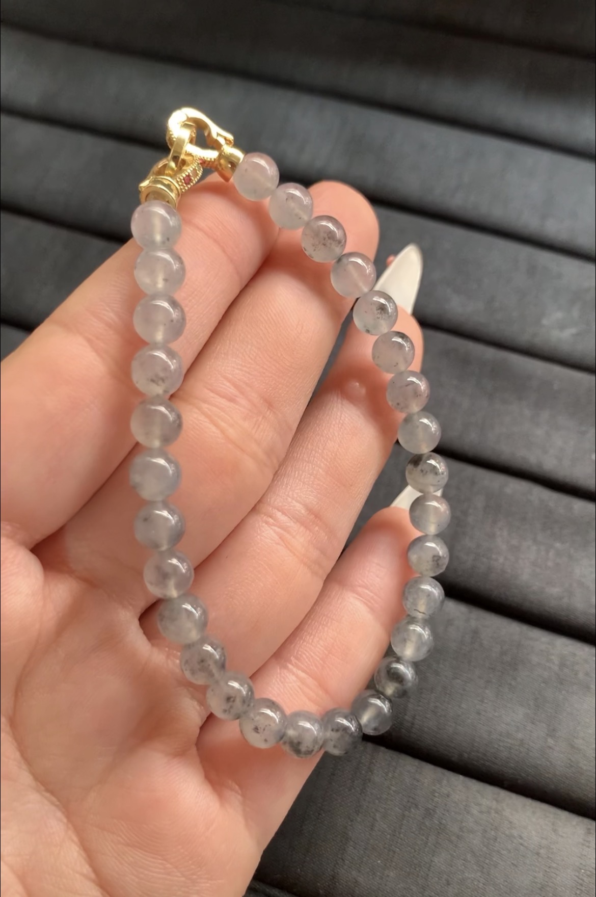 This delicate bracelet features small, perfectly round jade beads in a beautiful "black ice" or "ink jade" color. The stones are highly translucent with a pale, icy base and unique natural inclusions of dark grey and black, creating a misty and elegant appearance. Each bead is smoothly polished to a glossy finish, enhancing its clarity and natural texture. The bracelet is finished with an ornate gold clasp adorned with subtle red details, adding a touch of luxury and sophistication. The design is simple yet refined, making it a perfect everyday accessory.