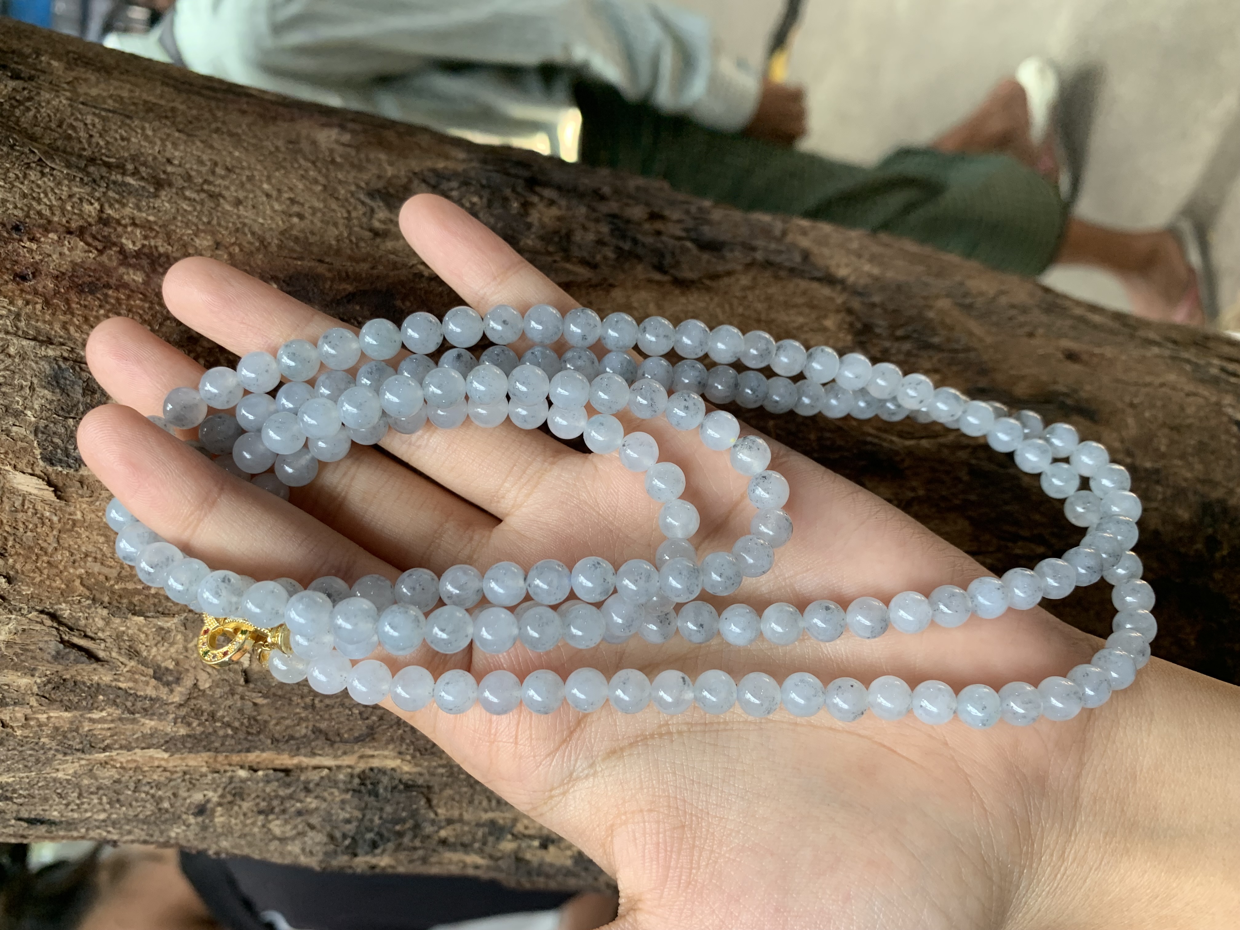 This stunning necklace is made up of small, round jade beads known as "black ice" or "ink jade". The stones have a translucent, pale base with delicate, natural inclusions and patterns of dark grey and black, creating a unique and textured look. Each bead is smoothly polished to a glossy finish, enhancing its clarity and natural beauty. Strung together in a long strand, this piece offers a modern and elegant design that highlights the distinctive character of the jade.