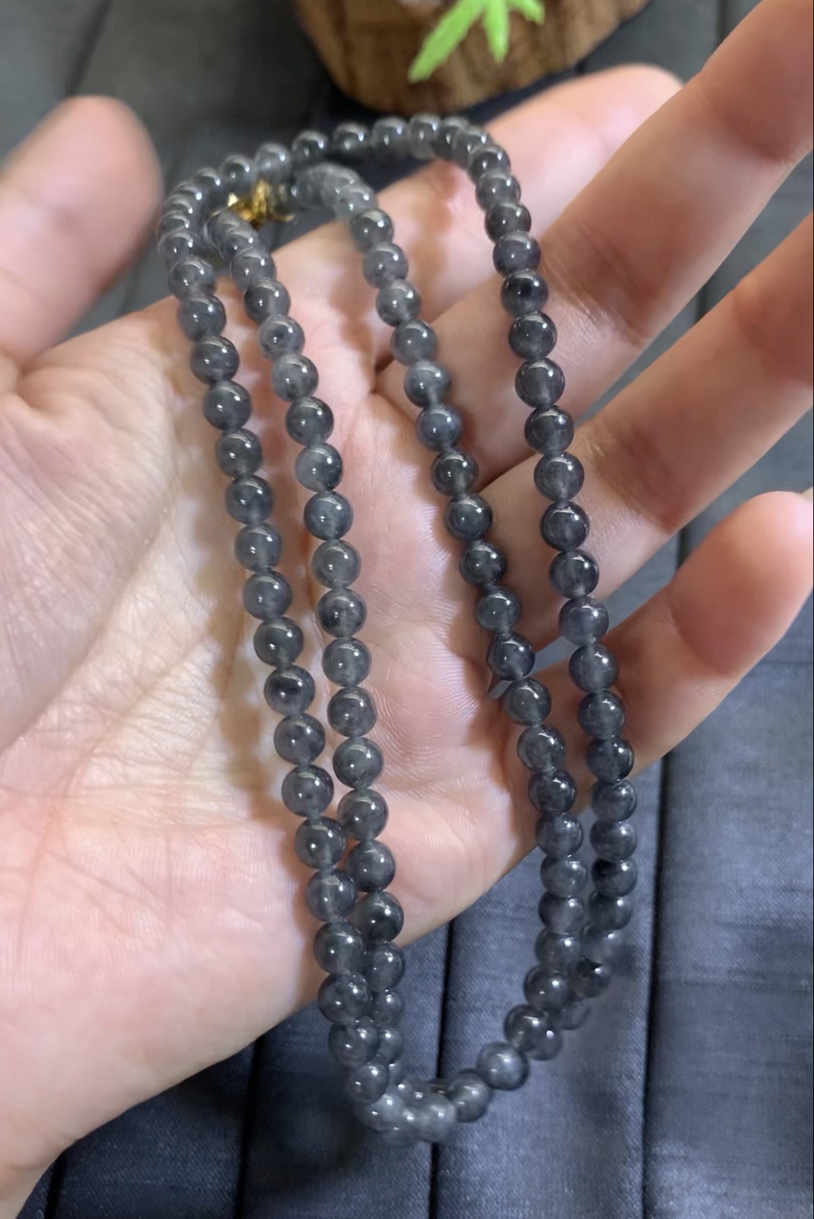 This unique necklace features a continuous strand of small, perfectly round natural jade beads in a deep black hue with subtle natural variations and textures. Each bead is smooth and polished to a glossy finish, showcasing the stone's natural character and a slight translucency that gives it a soft, matte glow. The uniform size and shape create a sleek, modern look, while the gold clasp adds a touch of classic contrast. Lightweight and versatile, it is perfect for adding an edgy yet elegant statement of natural beauty to any outfit.