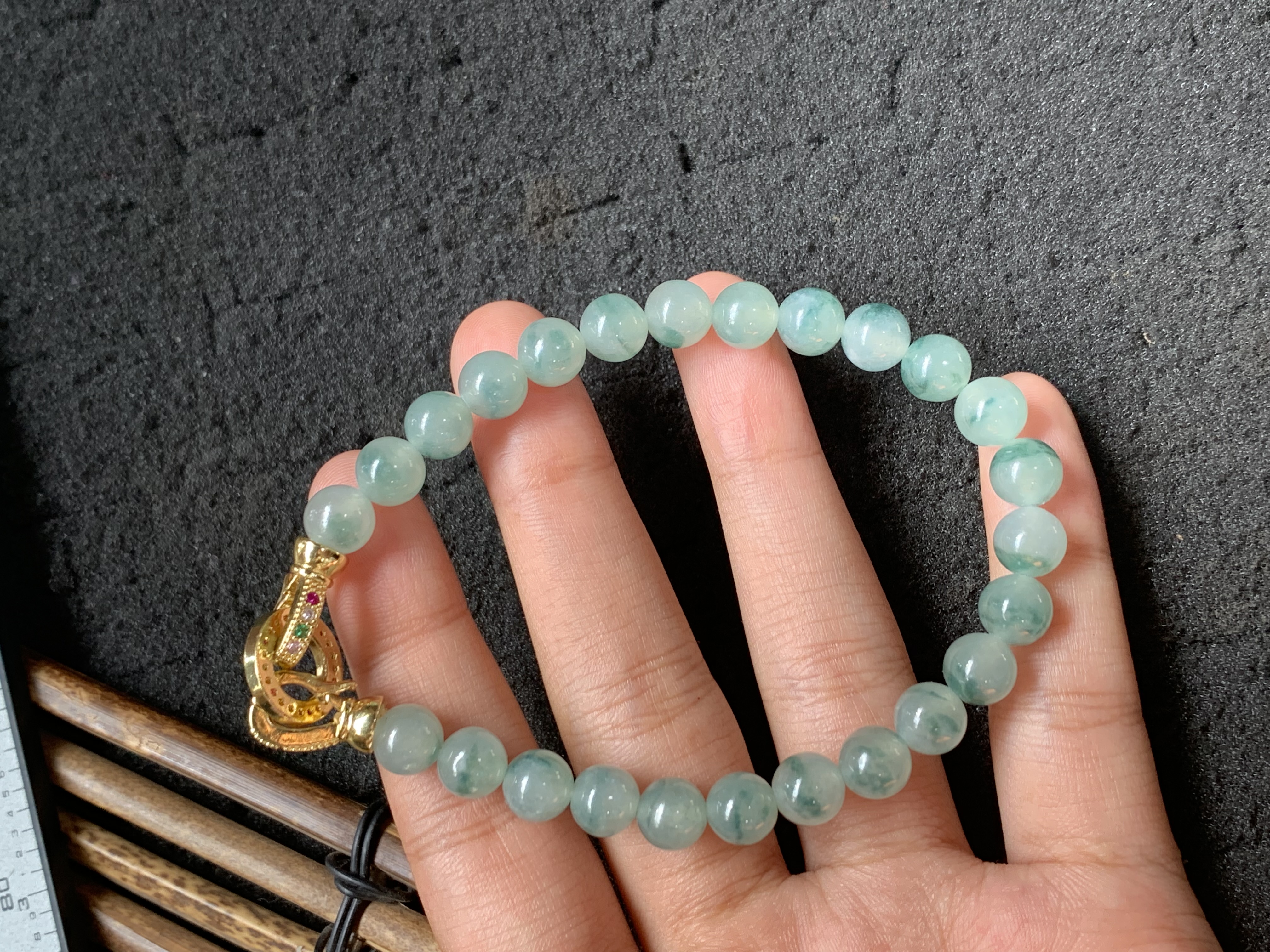 This elegant bracelet features small, perfectly round natural jade beads in a soothing blue-green shade. Each bead is smooth and polished to a glossy finish, showcasing excellent translucency and unique natural inclusions that add depth and character. The uniform size and shape create a sleek, refined look, while the ornate gold clasp adds a touch of classic luxury. Lightweight and comfortable to wear, it is perfect for adding a subtle pop of natural color and sophisticated charm to any outfit.
