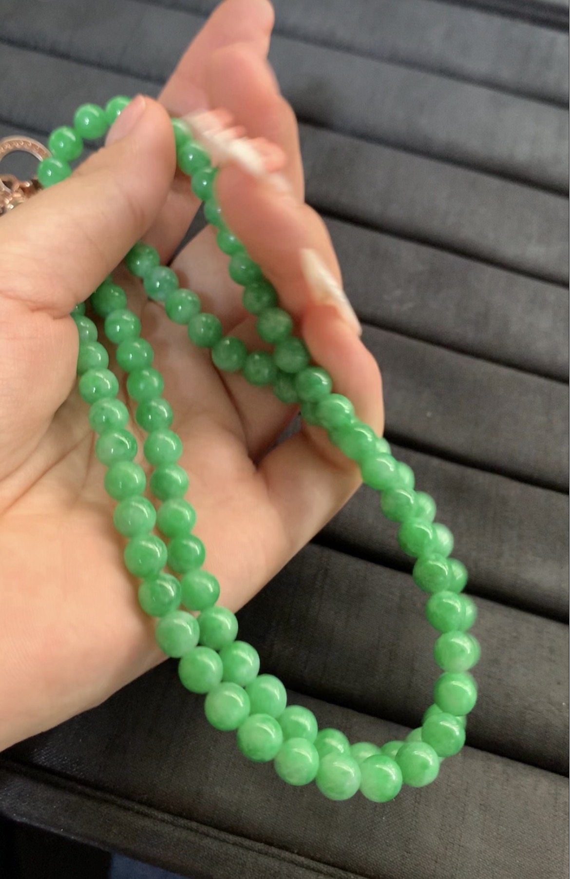 This stunning necklace features perfectly round jade beads in a vibrant, bright apple green color. The stones are highly polished to a smooth, glossy finish, exhibiting excellent translucency and a lively, natural luster. The color is rich and consistent throughout the strand, showcasing the high quality and beauty of the jade. The beads are strung together with a rose gold-toned clasp and accents, adding a touch of warmth and elegance. It is a classic and luxurious piece that makes a beautiful statement, perfect for enhancing any ensemble with its fresh and radiant hue.