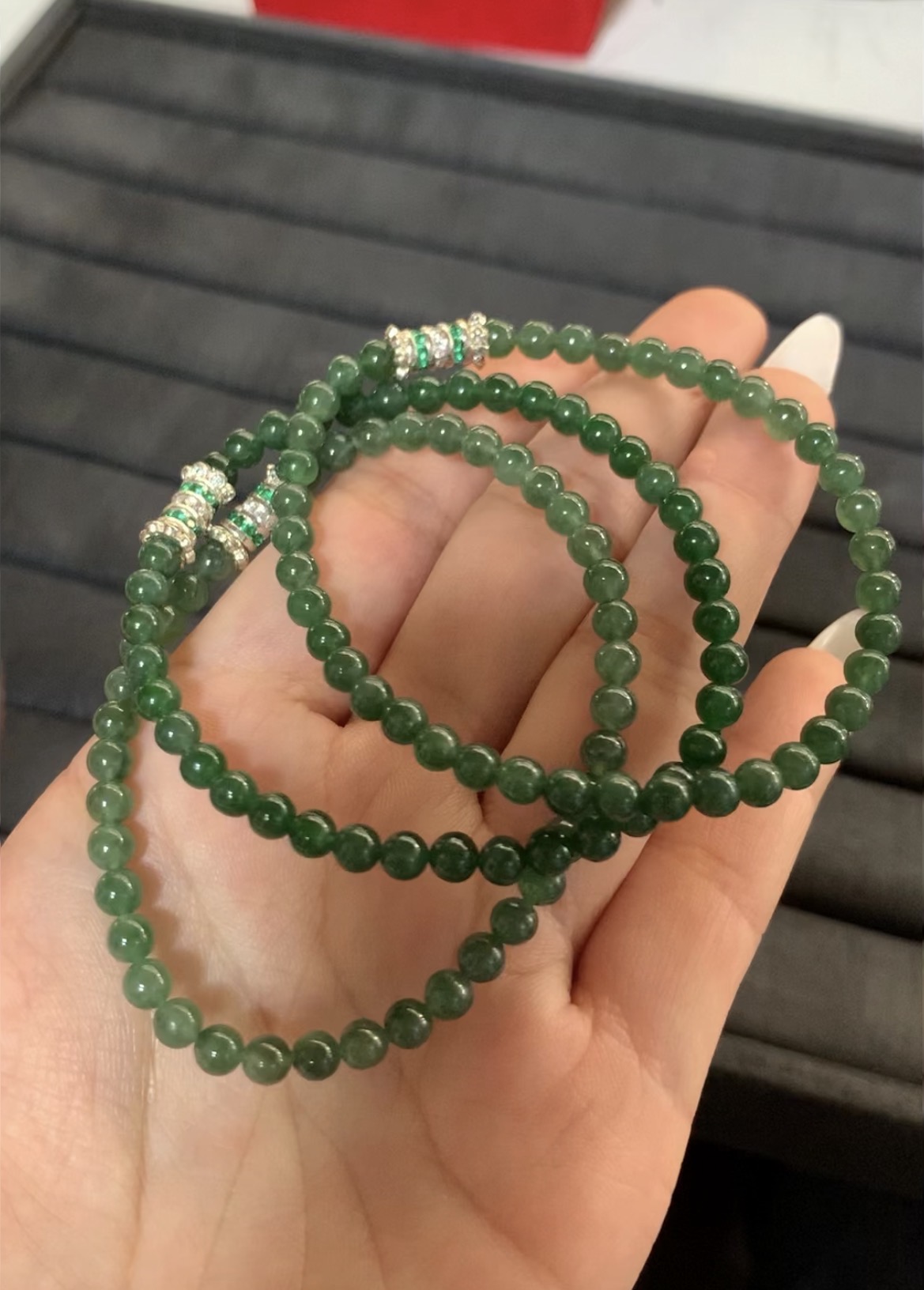 This striking necklace features small, perfectly round jade beads in a rich, deep green color. The stones possess a smooth, glossy finish and excellent translucency, giving them a vibrant and lustrous appearance. The uniform size and consistent hue of the beads create a sleek and elegant look. The design is enhanced by decorative spacer beads set with sparkling clear and green stones, adding a touch of glamour and detail. It is a versatile piece that can be worn as a single long strand or wrapped multiple times as a bracelet, offering a classic yet modern style that highlights the natural beauty of the jade.