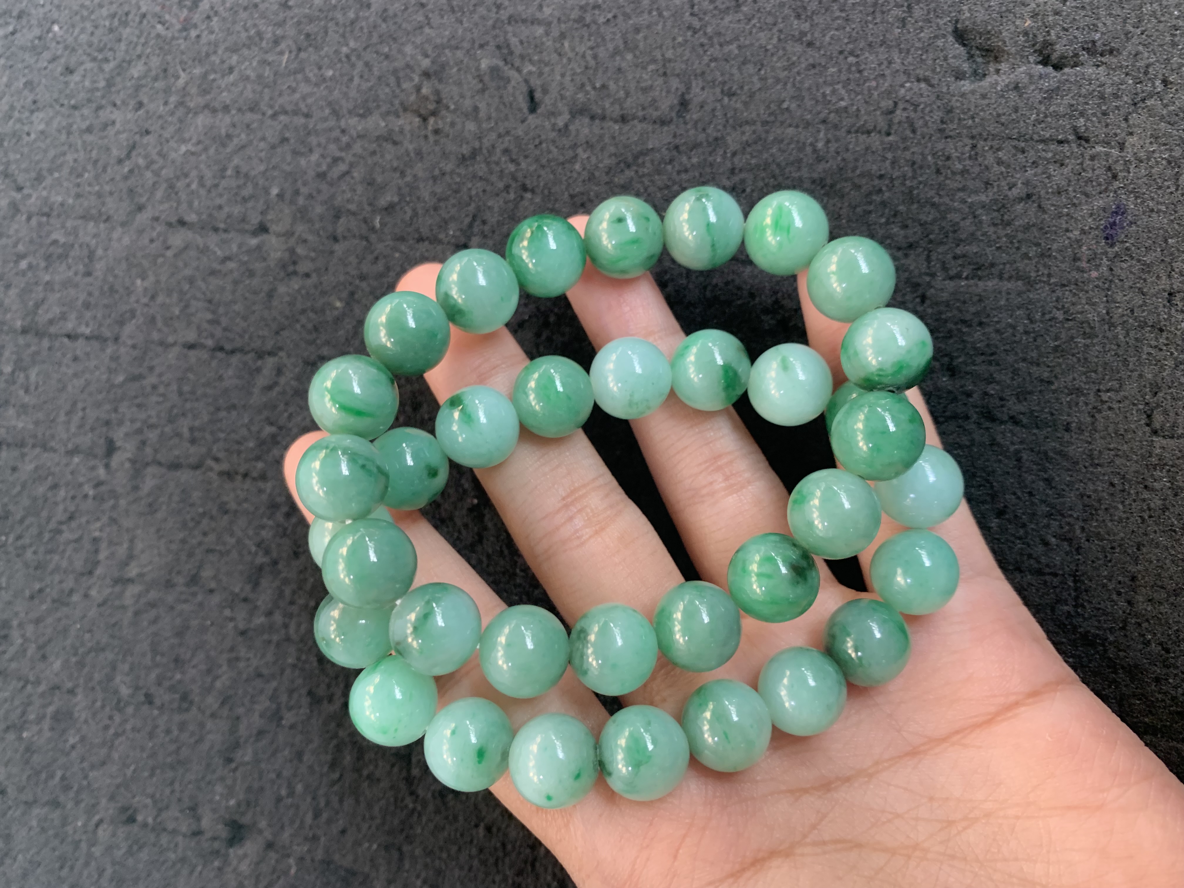 A set of round green gemstone bead bracelets (likely jade or similar stone) with smooth surfaces and subtle natural variations in hue and veining. The beads are uniformly sized, creating a polished and timeless look that is perfect for stacking or wearing alone as a calming, elegant accessory for everyday or casual occasions.