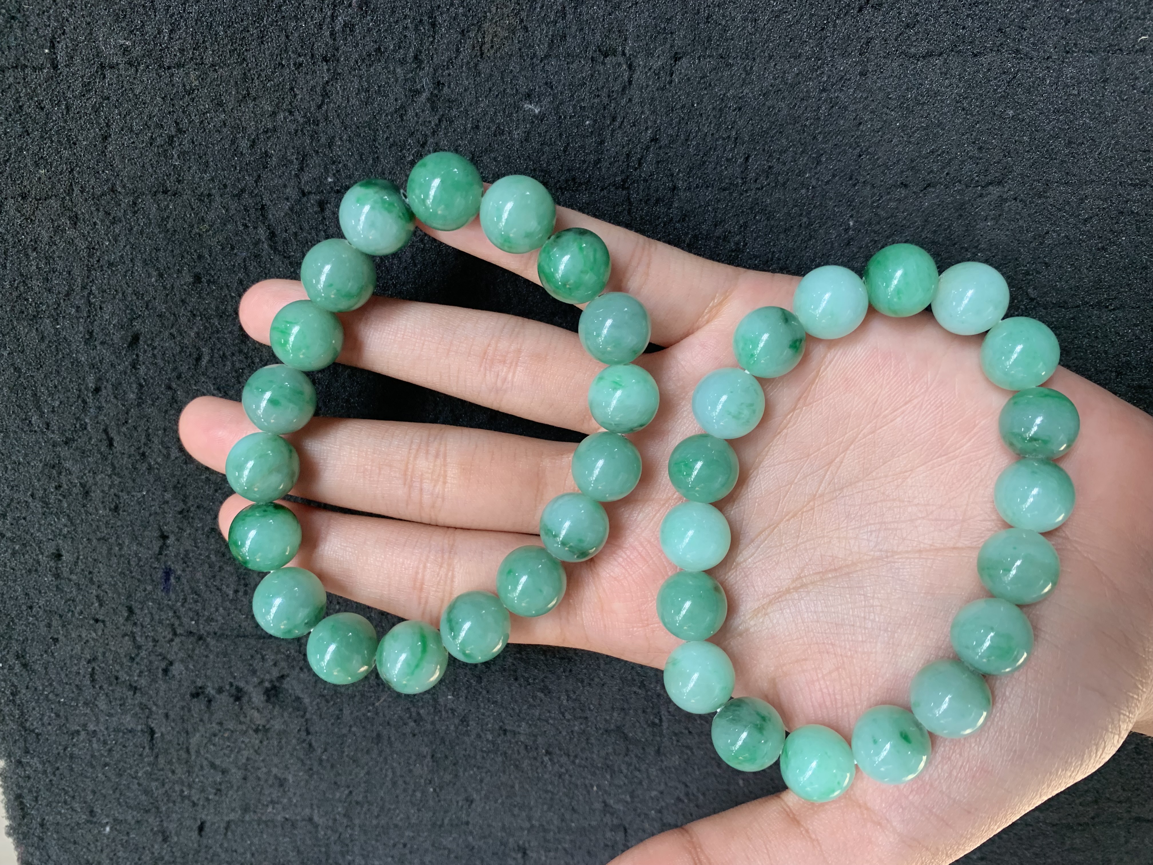 This beautiful bracelet is composed of round jade beads featuring a rich and vibrant green color with natural variations and subtle mottling throughout. The stones possess good translucency and a smooth, glossy finish that enhances their natural luster. Each bead is carefully selected for consistent size and quality, creating a harmonious and eye-catching appearance. The design is classic and timeless, making it a versatile accessory that adds a touch of natural elegance and color to any look. The beads are strung together to form a comfortable and durable band.